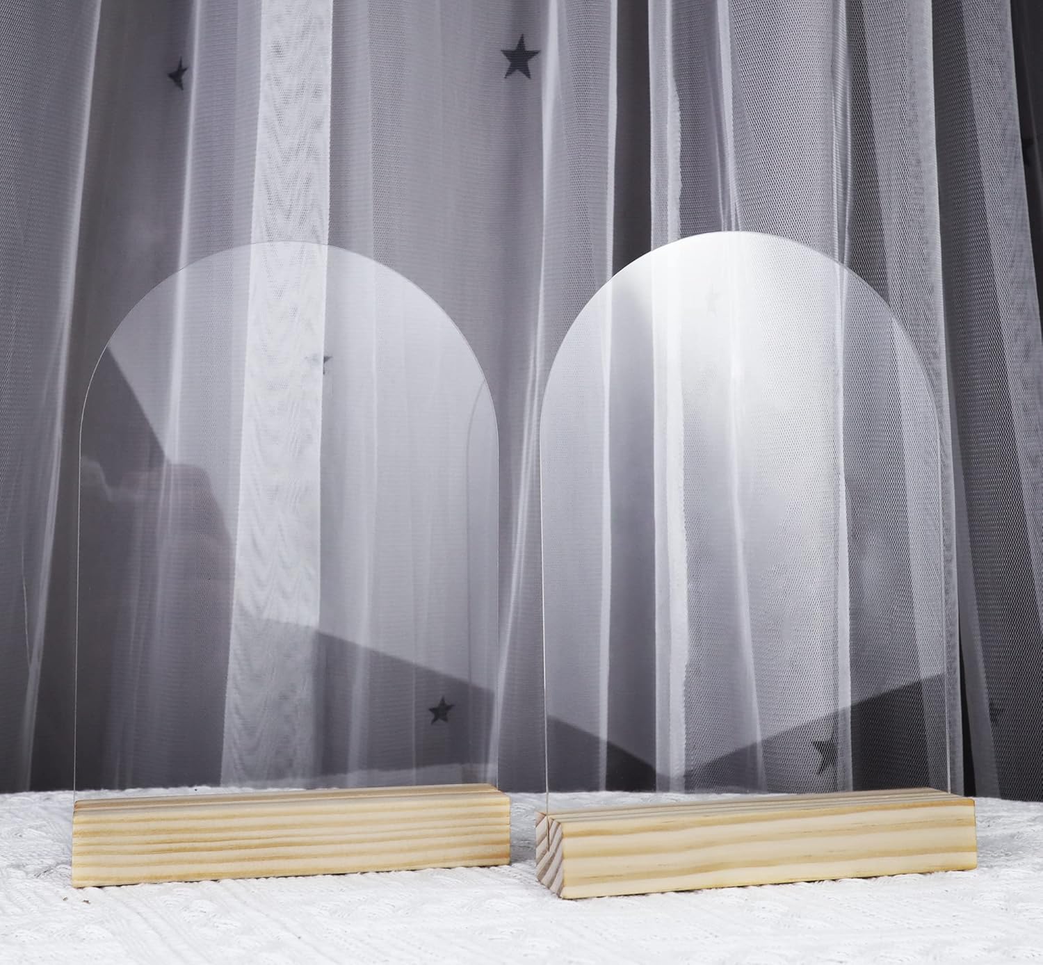 • Delicate Design - Glass look acrylic is in trend! Our arch acrylic sign holder with stand, adds a stylish and modern look to your event. These acrylic signs have Sturdy and wide wood base, which ensure that your table number, card, or photo will always be upright during your event. They would be perfect acrylic gift table arch sign holders, picture stands for table, wedding gift cards.