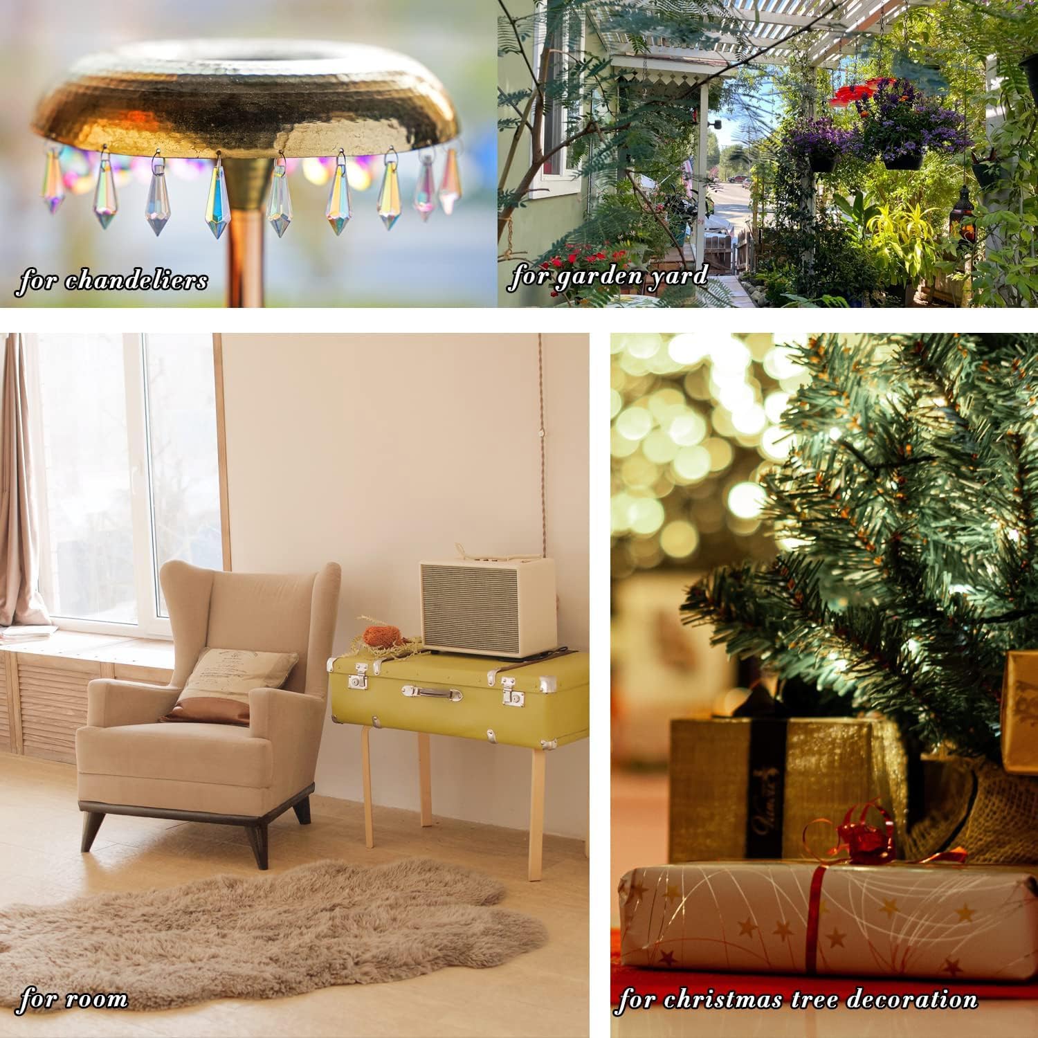 • MULTI FUNCTION-- Nice for Home Office Garden Window, Feng Shui Crystals, Chandelier Crystal Parts, Wedding Decoration, Christmas Tree Decor or any crystal projects. Good for sun catcher as a house, garden and car, It's also fun to turn these to enhance a new light fixture very pretty on your christmas tree, party decoration, DIY chandelier and more, get an amazing light and color show