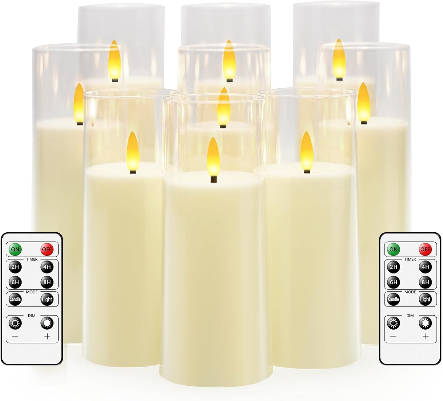 • FLAMELESS CANDLES WITH REMOTE CONTROL: Upgraded 10 Key Remote Control (Turn on/off, adjust the bright/dim and light/flicker)Once the timer is set, these remote control candles light up at the same time every day and stay on for 2/4/6/8 hours, every Repeat every 24 hours.No need to wake up and turn it off at midnight.