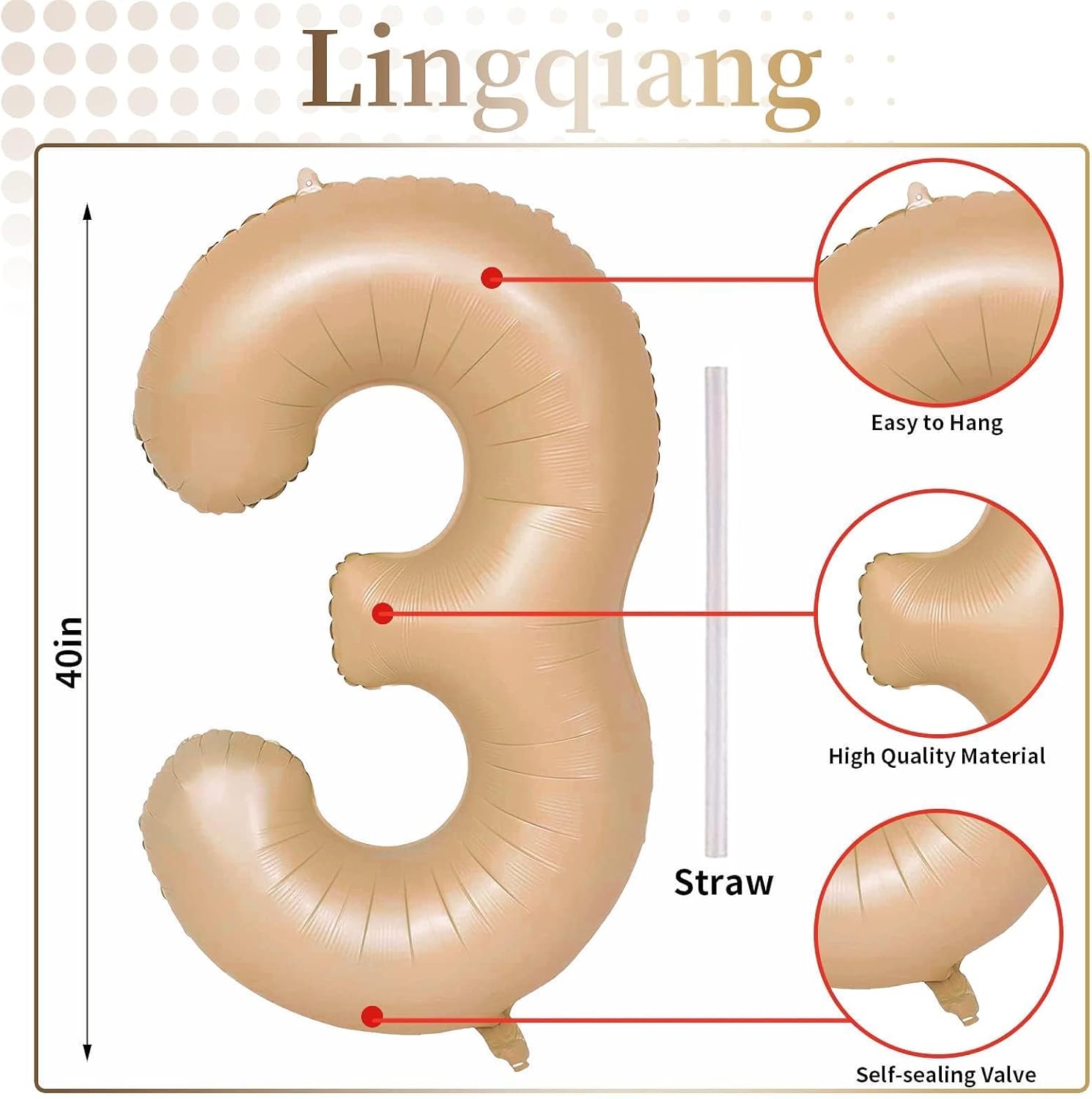 • πŸŽ‰ Easy to Inflate πŸŽ‰ - The big light brown number 3 foil balloons have self-sealing valve does not need to be knotted for easy inflation and deflation. It can be inflated with air or helium. When filled with helium, the balloons can float in the air; after filling, press the valve of the digital balloon to seal it. It can be reused. Do not throw away after use!