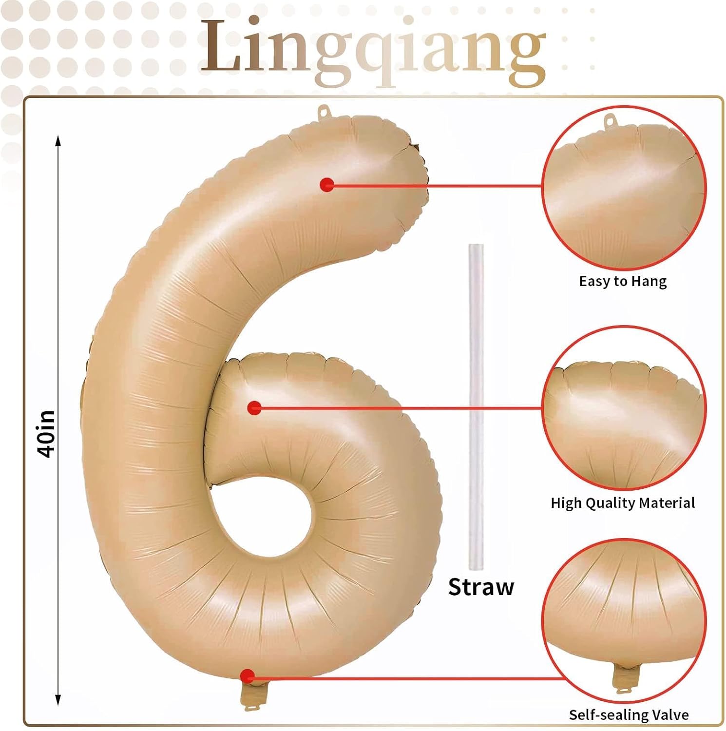 • πŸŽ‰ Easy to Inflate πŸŽ‰ - The big light brown number 6 foil balloons have self-sealing valve does not need to be knotted for easy inflation and deflation. It can be inflated with air or helium. When filled with helium, the balloons can float in the air; after filling, press the valve of the digital balloon to seal it. It can be reused. Do not throw away after use!