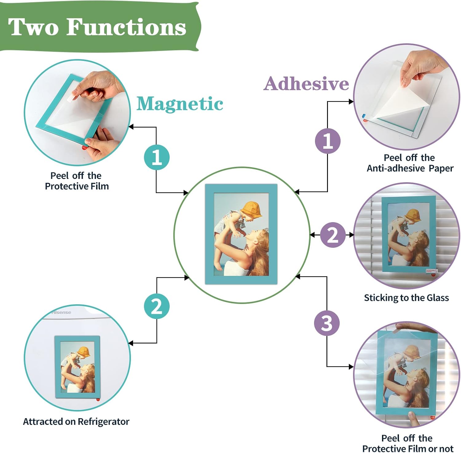 • Same as traditional magnetic frames to stick to refrigerators and lockers, CRUGLA 4x6 magnetic frames also have an adhesive backing to stick on the glass, doors, cubicles, shop windows...