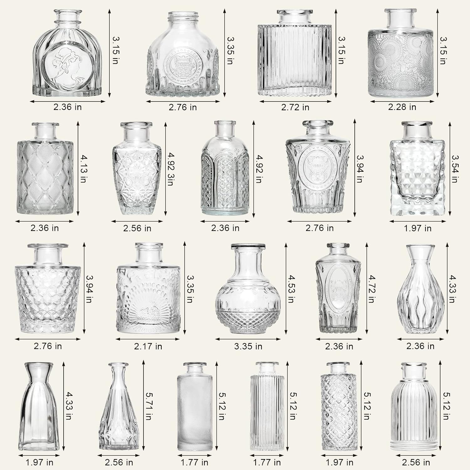 • Vintage Design: You get 32 glass bud vase, each small glass vase is decorated with etched patterns to further enhance its attractiveness. They are very classy and can be used in any environment, from elegant to simple and casual. They will become a beautiful decorative center on your window sill, dining table or wedding reception table