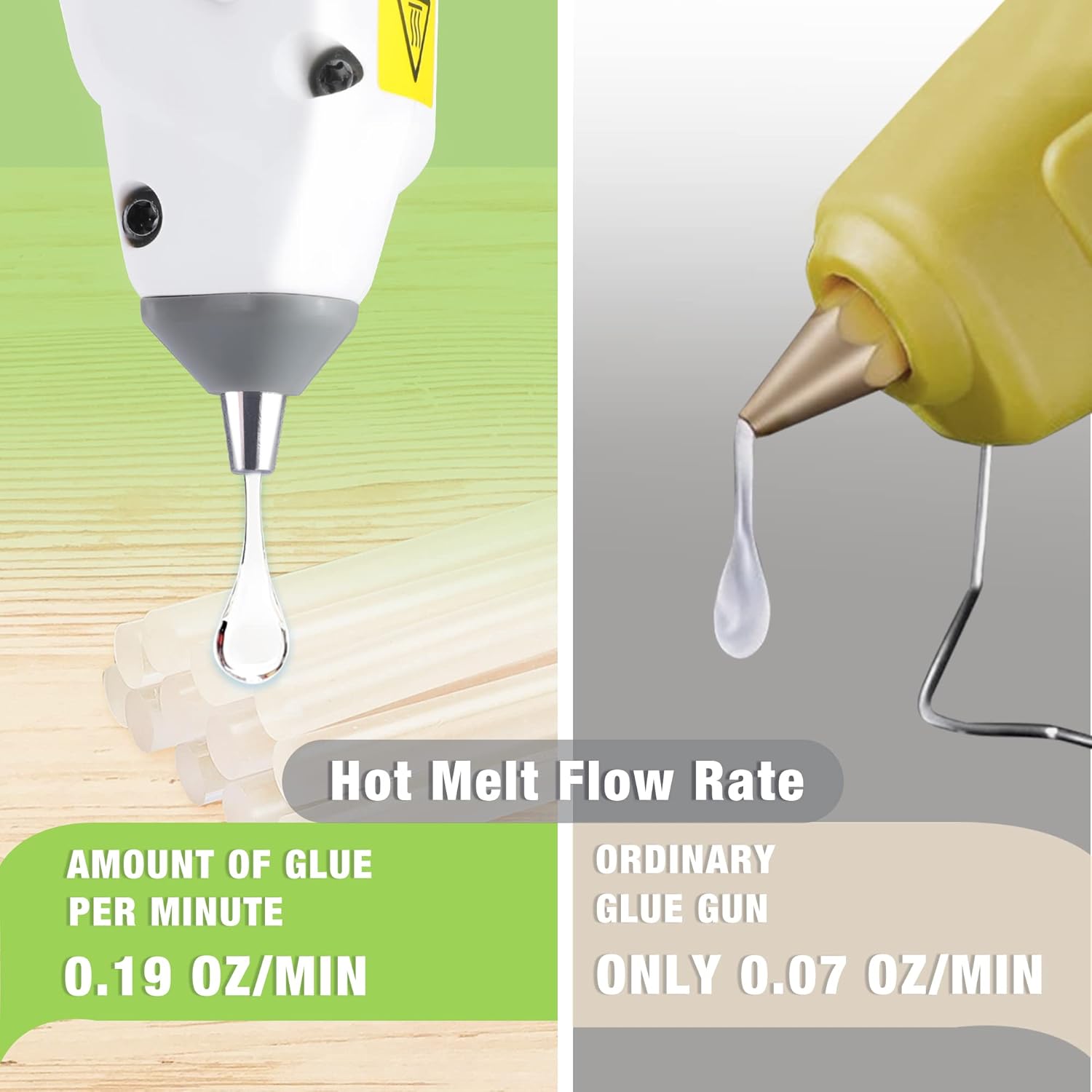 • Fast Glue Output: This wireless hot glue gun has a very fast glue output speed, dispensing 0.18oz/5g per minute, much faster than the 0.07oz/2g per minute of ordinary hot glue guns. The glue gun cordless also features a low-leakage nozzle design, effectively reducing glue spillage, saving more glue sticks, and keeping your work area clean. Additionally, the battery operated glue gun comes with a vertical stand that can be placed on a stable surface, making it convenient to use at any time