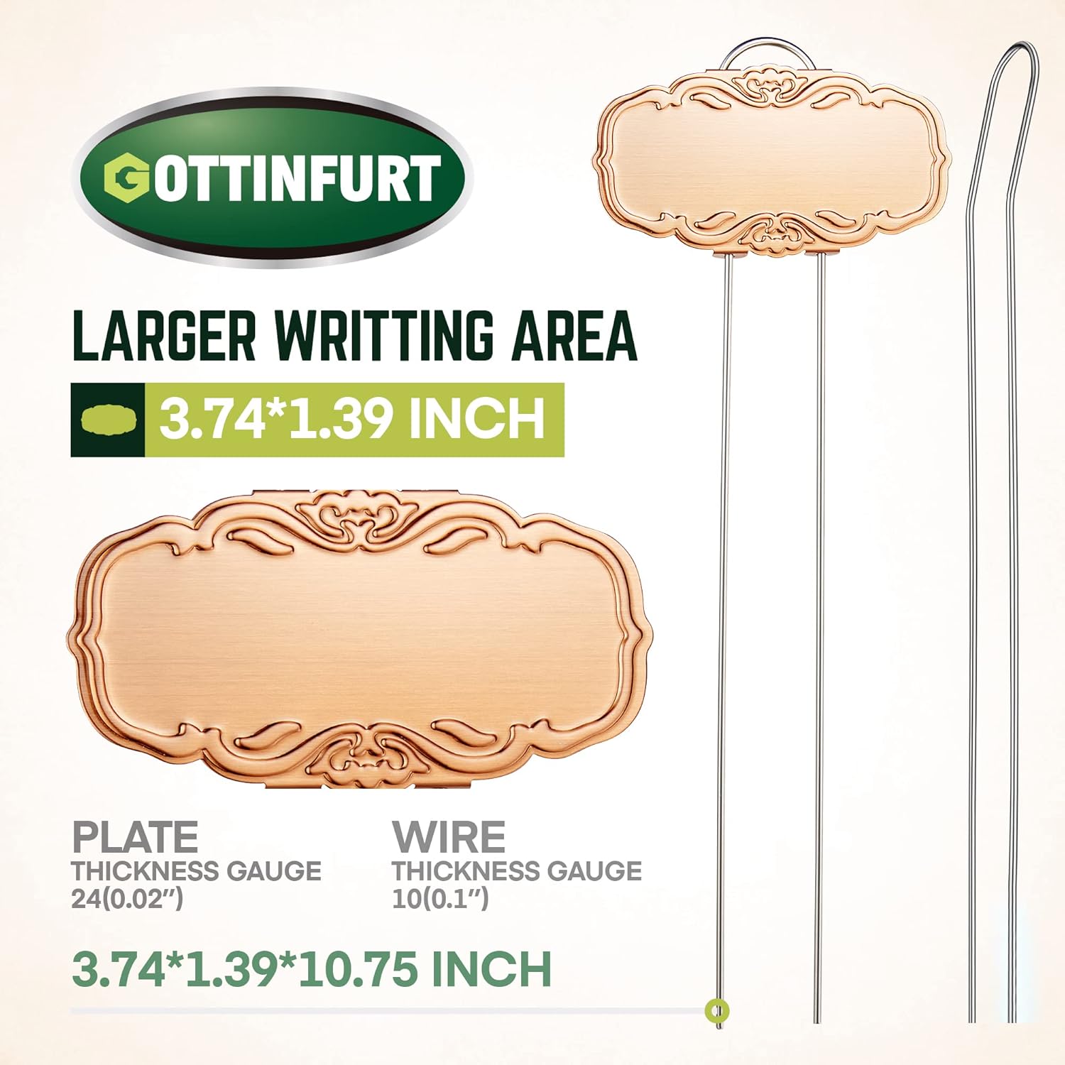 • The whimsical arch design creates a warm and romantic garden atmosphere. Each nameplate measures 3.74x1.39 inches, allowing for plenty of space to write on. The sturdy 10.75” double pronged stakes are easy to insert into the soil and read the labels from a standing position.