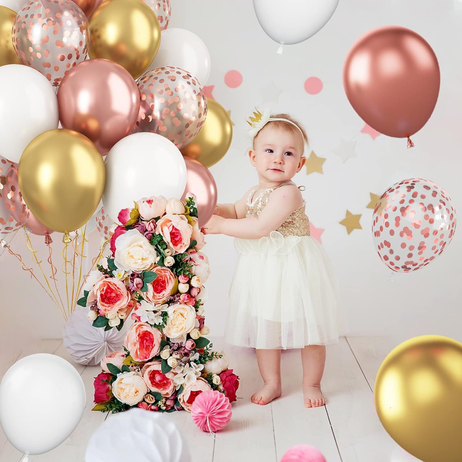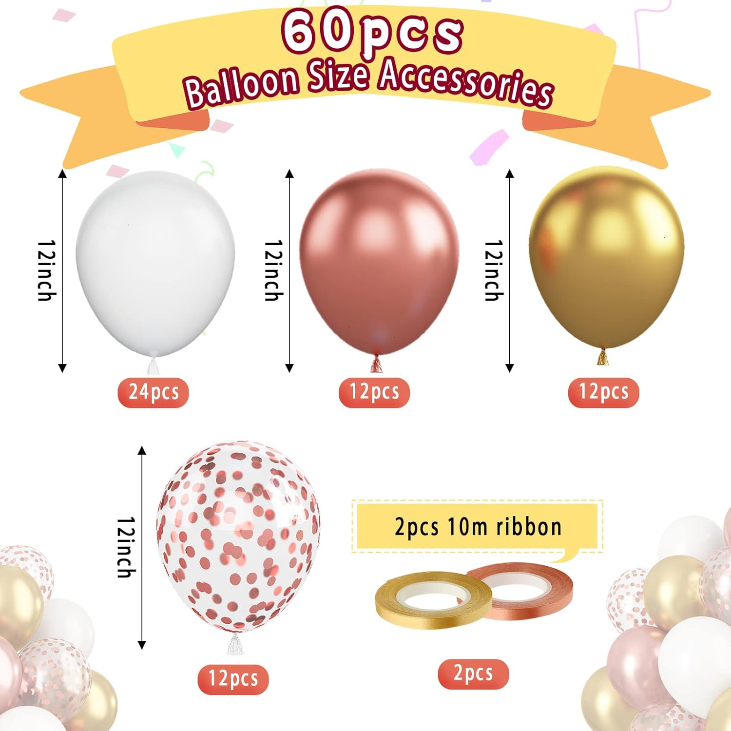 • Mixed Balloons Set: The 12 inch rose gold and white balloons set includes 12pcs metallic gold balloons, 24pcs matte white balloons, 12pcs metallic rose gold balloons, 12pcs rose gold confetti balloons, 2 roll of ribbon. 62pcs in total. A variety of gold latex balloons are suitable for your beautiful art theme decoration.