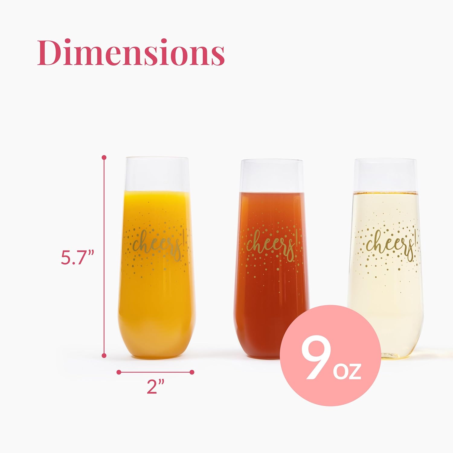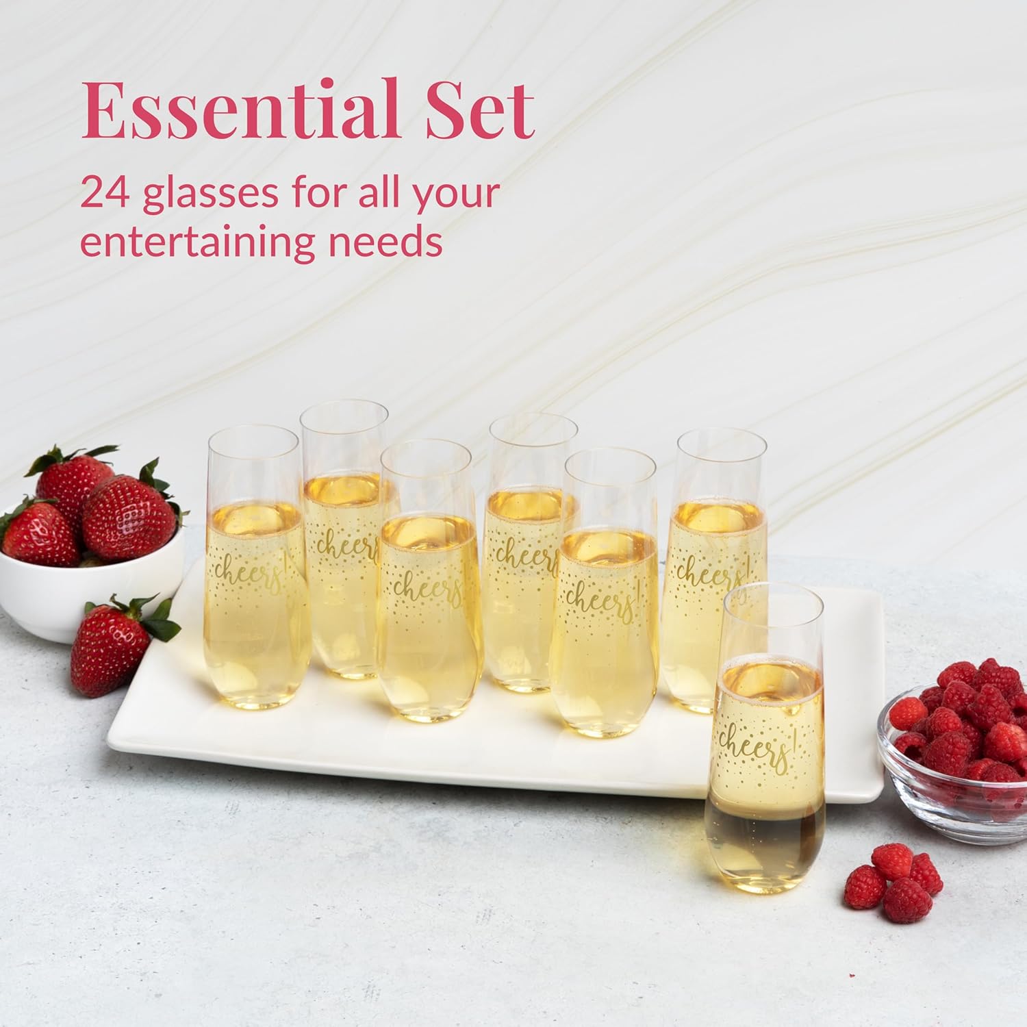 • WHAT'S INCLUDED: Set of 24 shatterproof 9oz stemless champagne flutes designed with Cheers text to hold wines, champagnes, sparkling drinks etc.