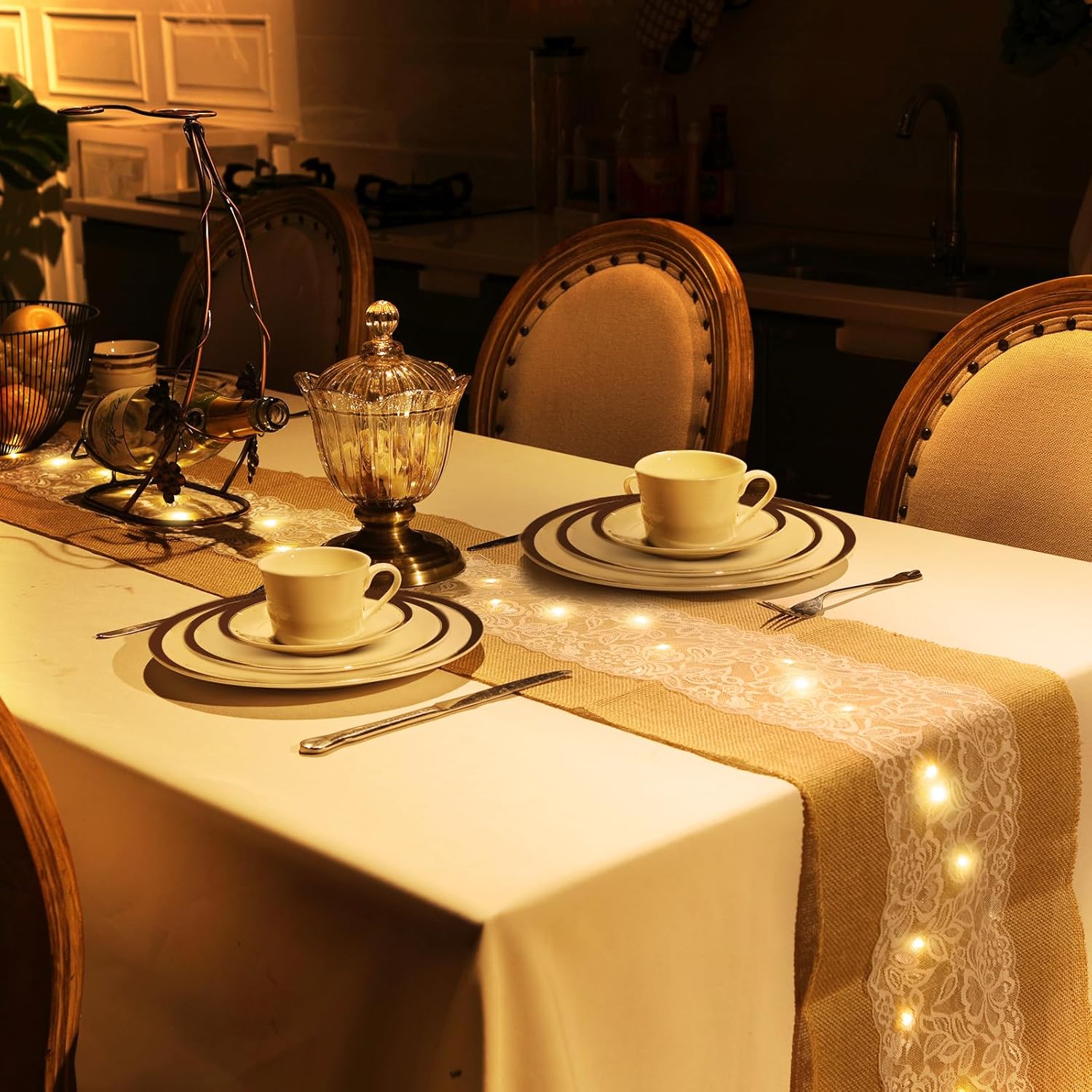 • Light-Up Rustic Elegance: Each burlap table runner features 40 hidden LED bulbs woven under lace, adding a warm glow to weddings, holiday dinners, or evening parties, creating a romantic and festive dining atmosphere