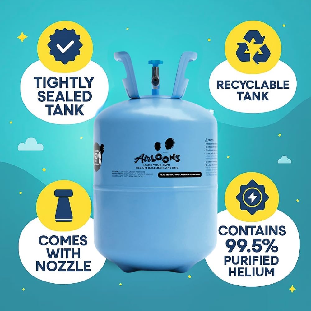 • Included Components : Helium Tank, 30 Multicolor 9 inch Latex Balloons, Spool of Curling Ribbon