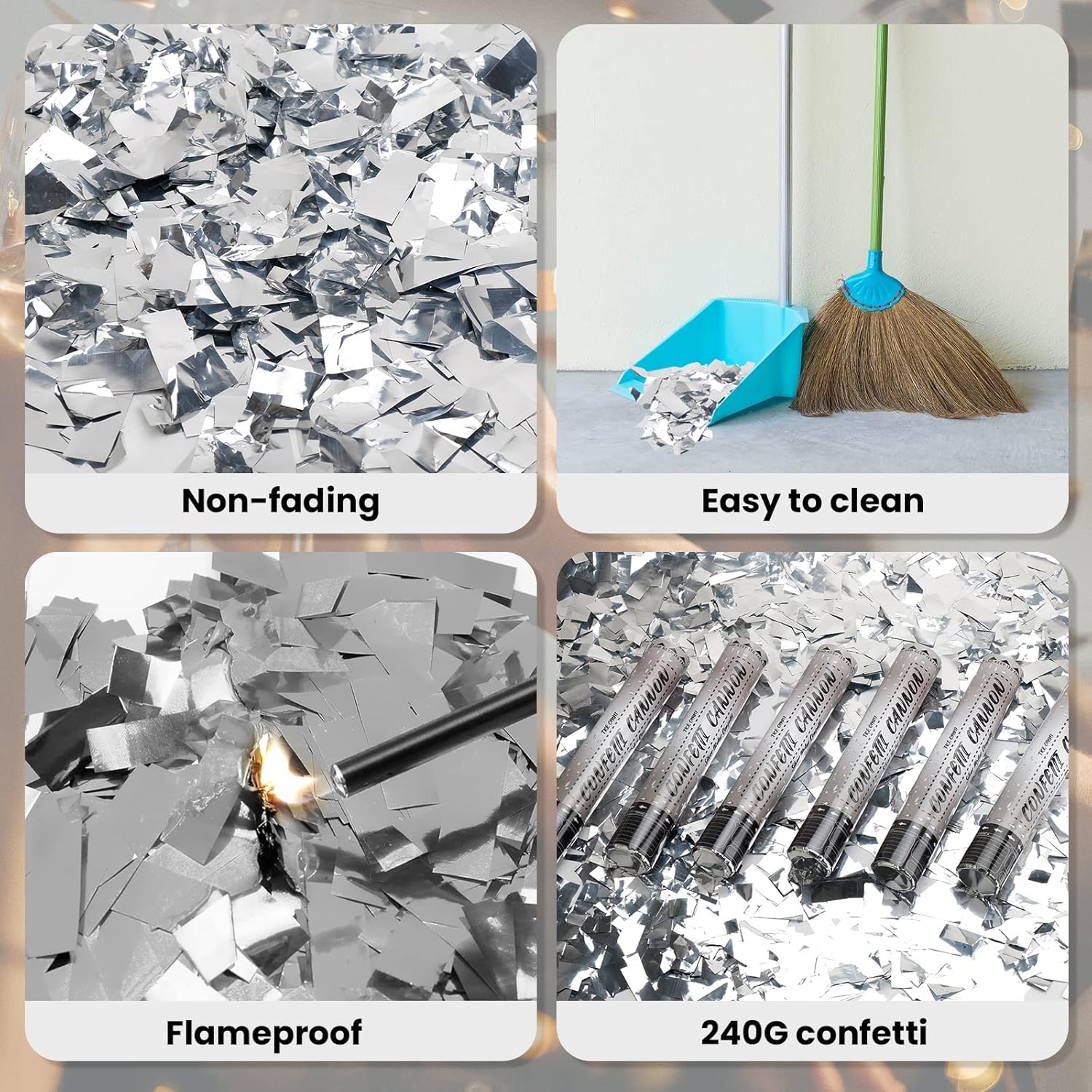 • πŸŽ‰ Mega-Value Confetti Cannons: We offer you a set of premium confetti poppers at a price that won't break the bank. Each large confetti cannon is 12 x 2 inches (30 x 5cm), filled with exciting confetti made of fireproof and non-fade silver mylar!