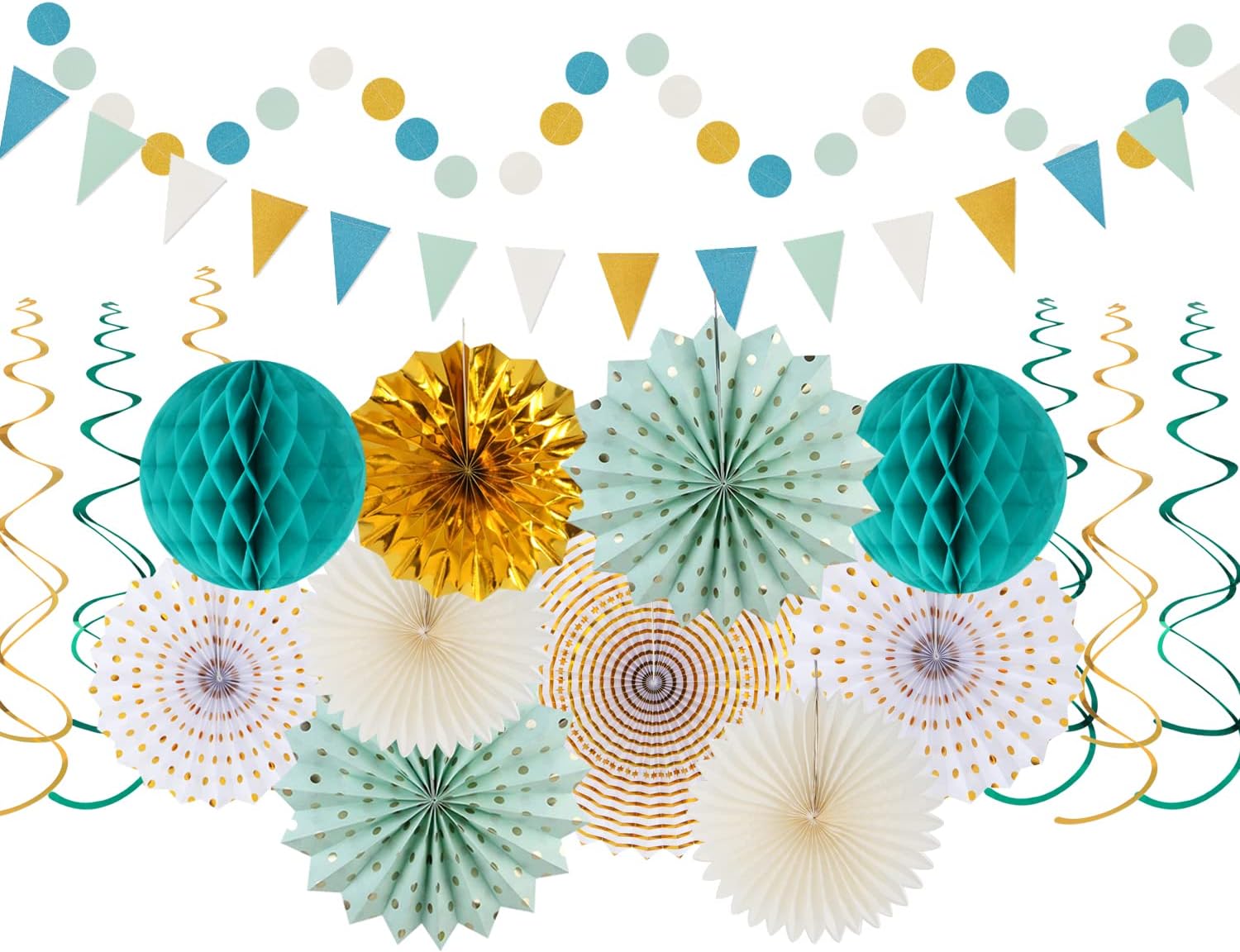 Teal-Gold Sage Green Party-Decoration - 33pcs Kits Tissue Pom Poms Honeycomb,Banner,Streamers Tassel Garland,Paper Lantern Fans,Wedding Engagement Bachelorette Birthday Baby Bridal Shower Decor Hugtmr