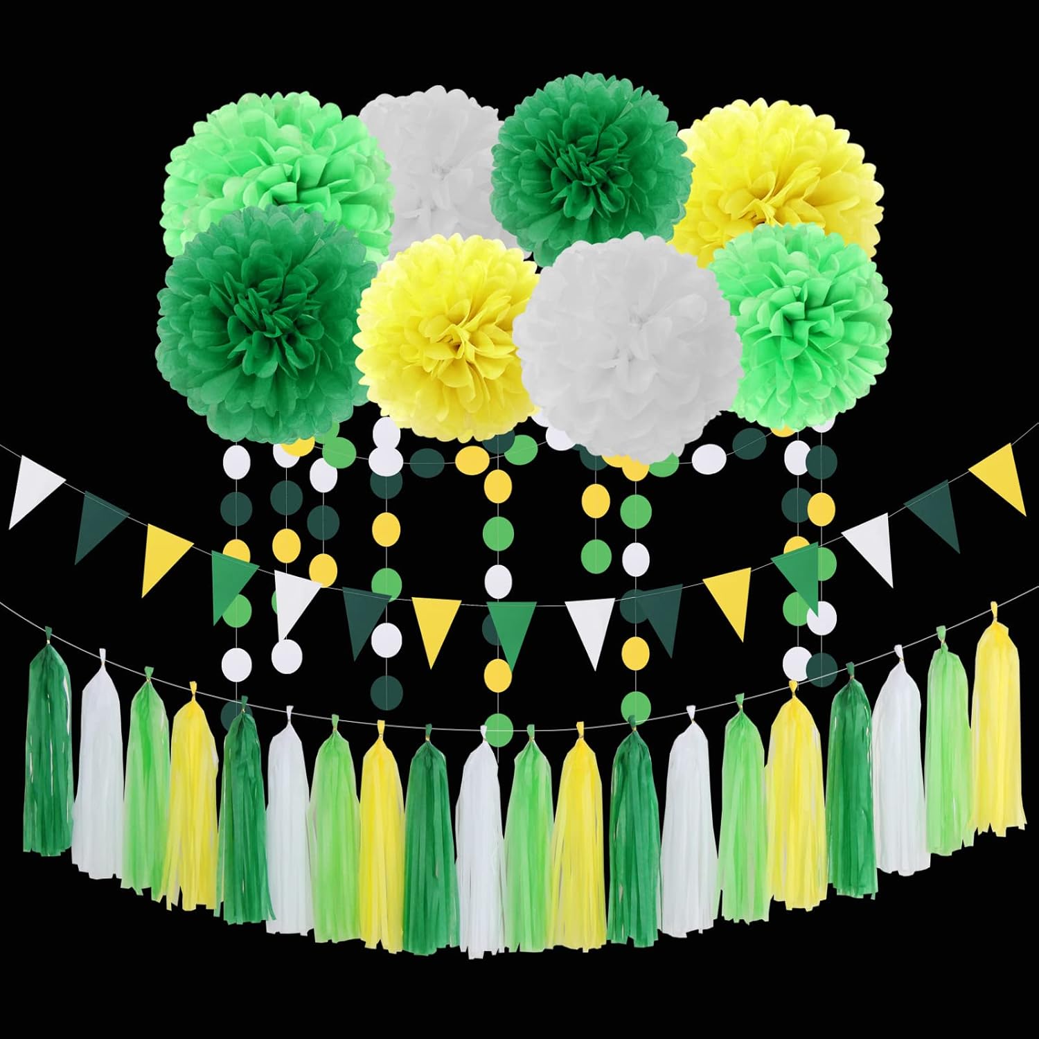 • 【Package Contains】The yellow green white party kits include 6pcs tissue paper flowers: 4pcs 8" and 4pcs 10" in four color, 1pcs Triangle Flags,1pcs circle dots paper garland,20pcs tassel garland. Total 30pcs.