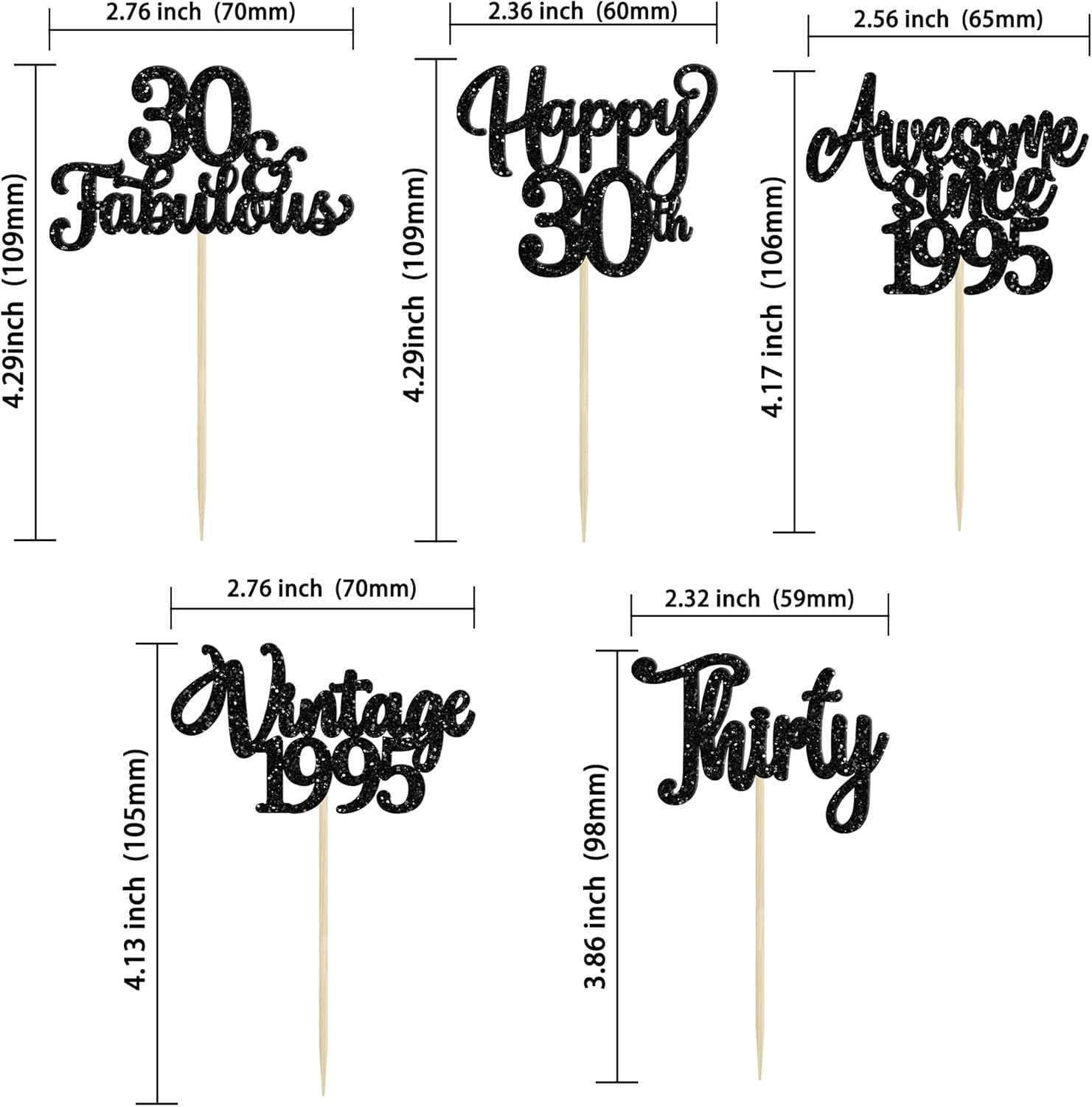 30Pcs Happy 30th Birthday Cupcake Toppers Glitter Thirty Vintage 1995 Cupcake Picks Cheers to 30 Fabulous Cake Decorations for 30th Birthday Wedding Anniversary Party Supplies Black