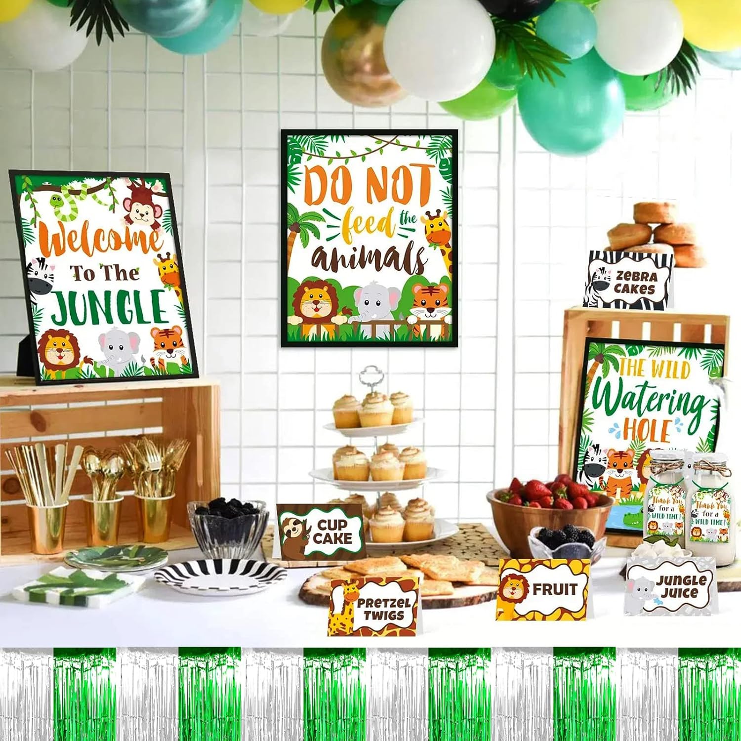 4 Pack 29x108 Inch Metallic Foil Fringe Tinsel Table Skirts for Rectangle Tables Streamer Backdrop for Wedding, Birthday, Parade Floats, Christmas, Halloween Party Decoration(Silver Green)