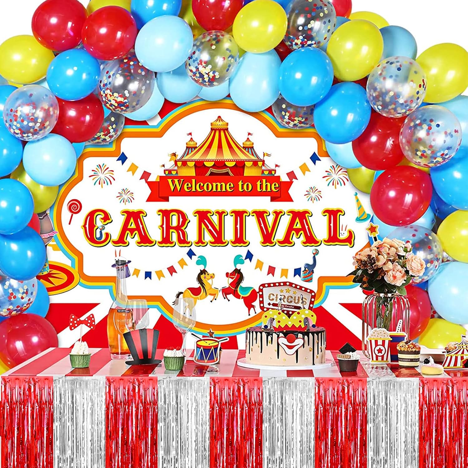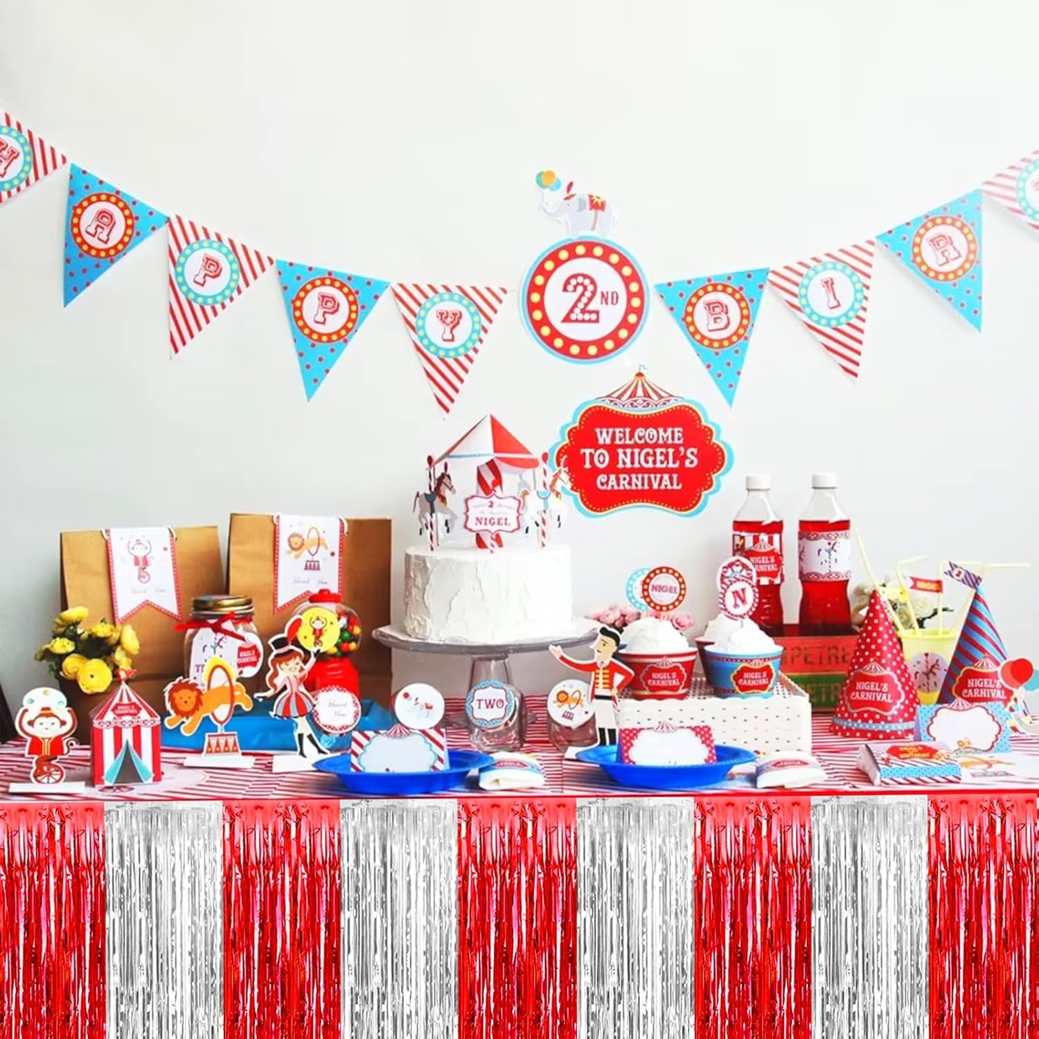 4 Pack 29x108 Inch Metallic Foil Fringe Tinsel Table Skirts for Rectangle Tables Streamer Backdrop for Wedding, Birthday, Parade Floats, Christmas, Halloween Party Decoration(Red Silver)