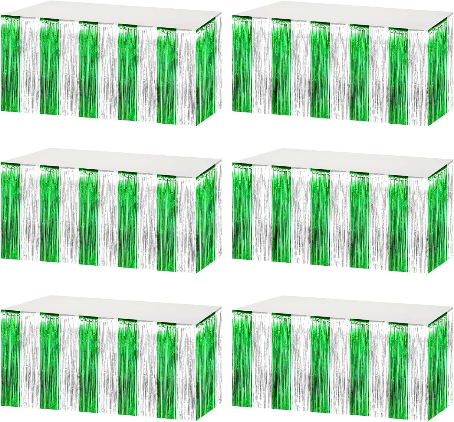6 Pack 29x108 Inch Silver Green Metallic Foil Fringe Tinsel Table Skirts for Rectangle Tables Streamer Curtains Backdrop for Birthday, Parade Floats, Mardi Gras, St Patrick Day Party Decoration