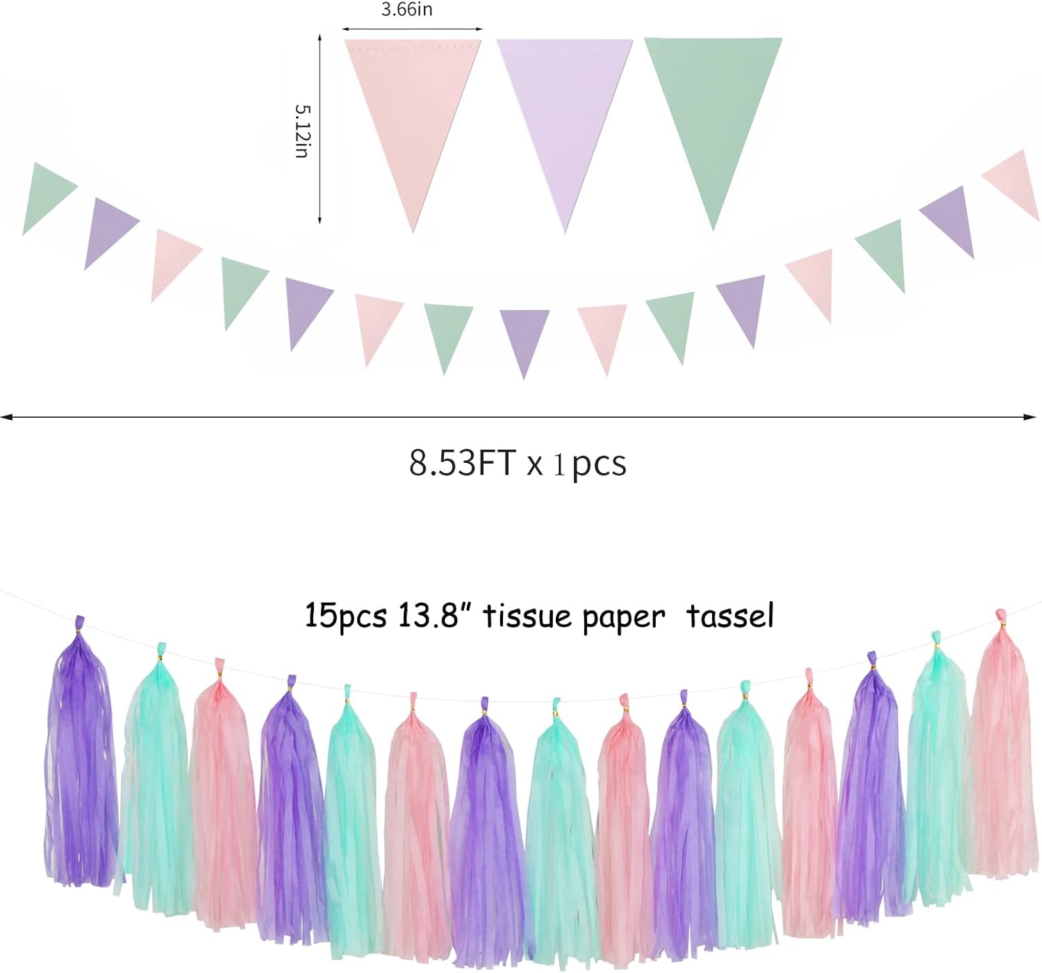 • 【Package Contains】The light pink light purple mint party kits include 6pcs tissue paper flowers: 3pcs 8" and 3pcs 10" in three color, 1pcs Triangle Flags,1pcs circle dots paper garland,15pcs tassel garland. Total 23pcs.
