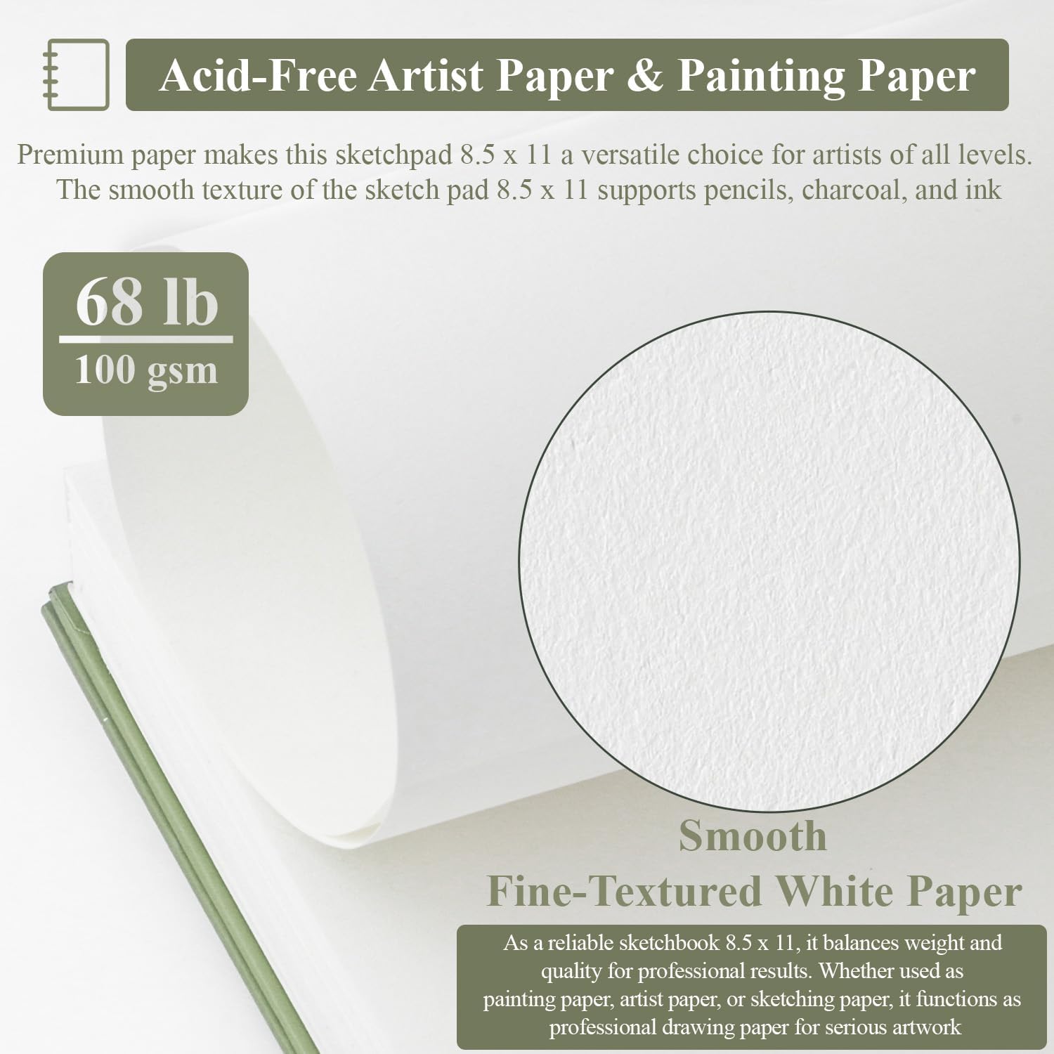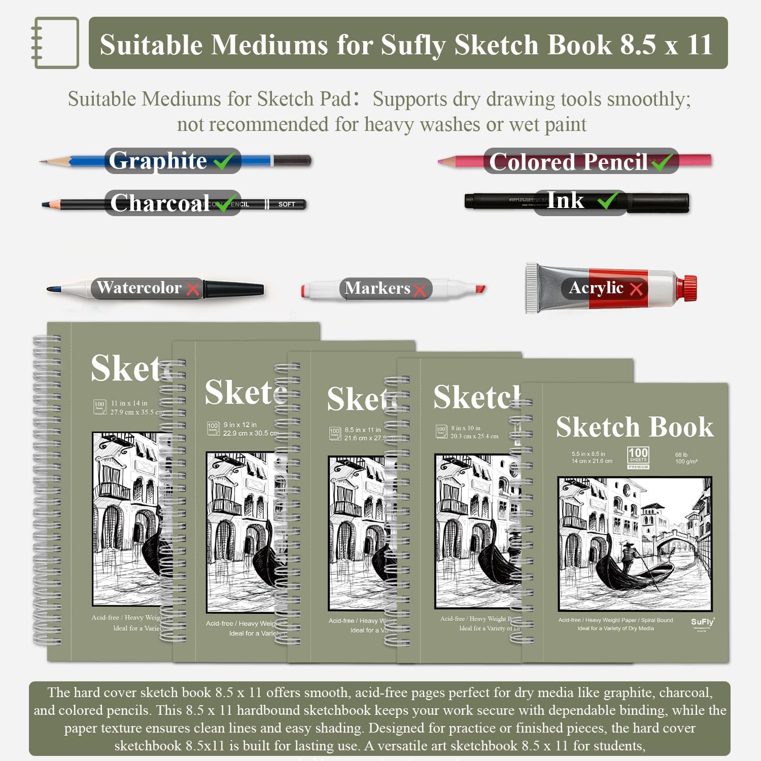 • 【sketch book 8.5 x 11] - PREMIUM MATERIAL SKETCH BOOK - SuFly art sketchbook 8.5 x 11 consists of 100 sheets of high quality acid-none and PH-neutral drawing paper with a thickness of 100 gsm, the sketch pad 8.5x11 is sturdy enough to withstand multiple wipes while maintaining the original roughness of sketch book for kids that allows dry media to grip (such as graphite, charcoal, pencil, etc.), sketch pads for drawing for teens would be a trusted choice for thousands of artists.