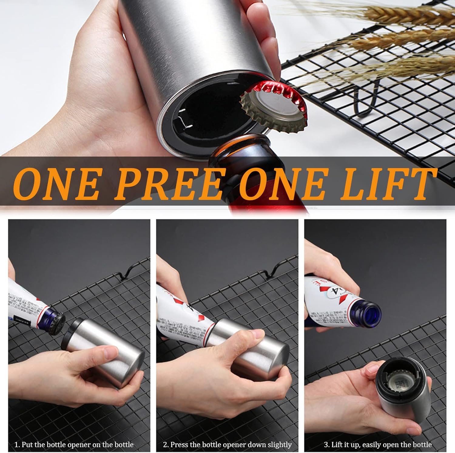 • WHAT YOU GET?-Great gifts choice, You will get 3pcs silver stainless steel automatic bottle opener. Only press and pop the bottle lid cap quickly. This push down bottle opener's easy-action and no wrist-twist design. It can easily remove the bottle cap from the bottle with one hand.