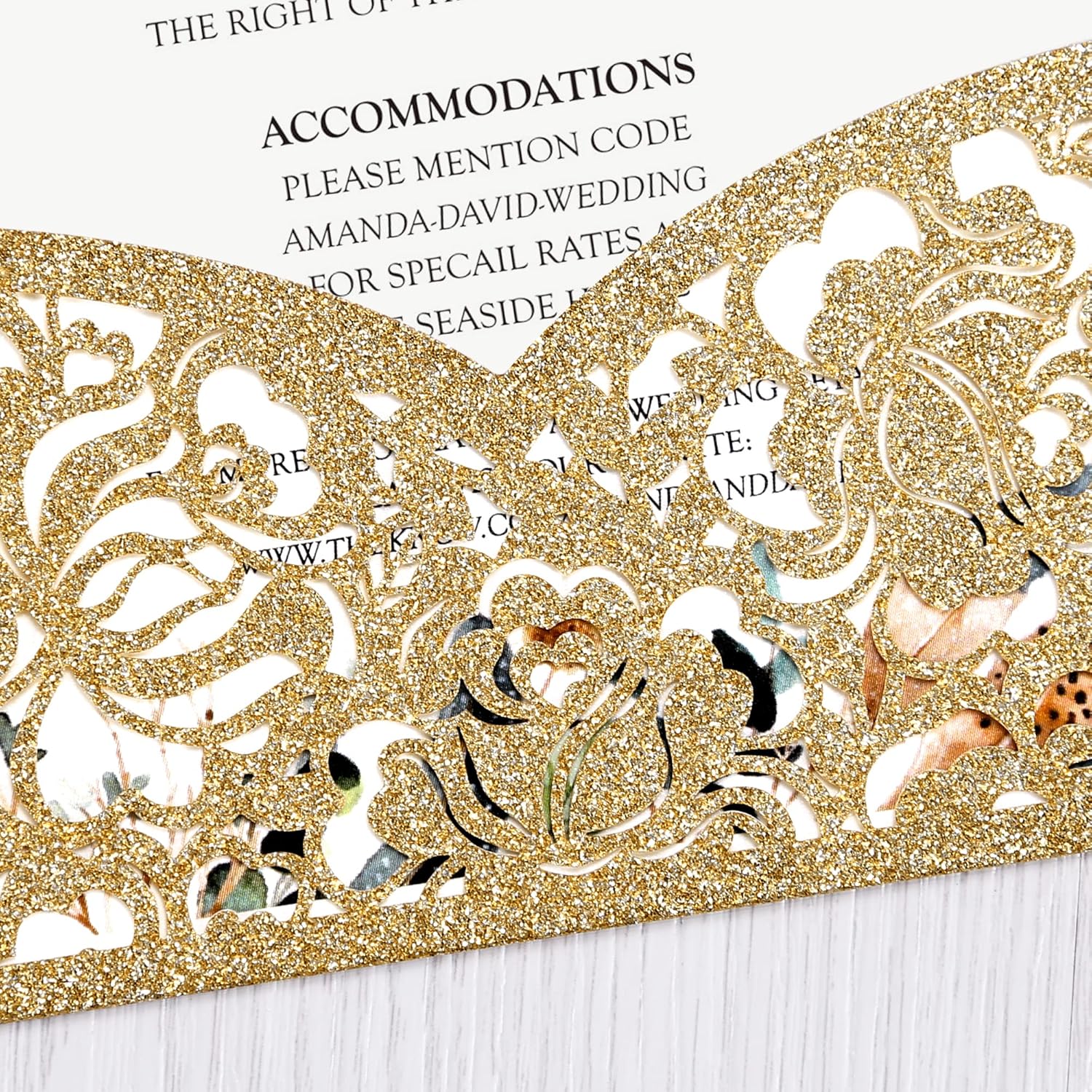 • 【The glitter gold laser cut wedding invitations include】100 personalized inserts, 50 laser cut glitter gold wedding invitation sleeves, 50 invitation envelopes, 50 seal stickers. Double sided tapes are included for envelope sealing and invitation assembling.