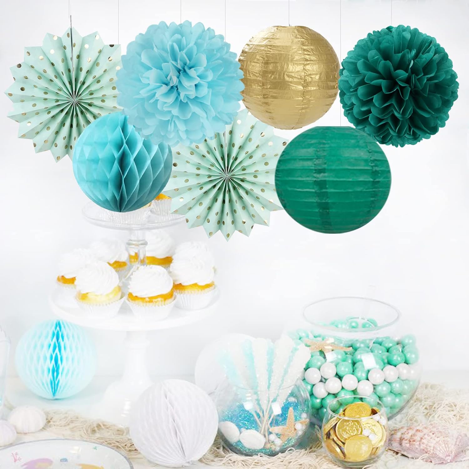 • 【Package Contains】The sage green teal blue gold party kits include 6pcs tissue paper flowers: 3pcs 10" and 3pcs 12" in three color, 4pcs 8inch paper honeycom ball,2pcs 8inch paper lantern, 2pcs 12inch paper fan.