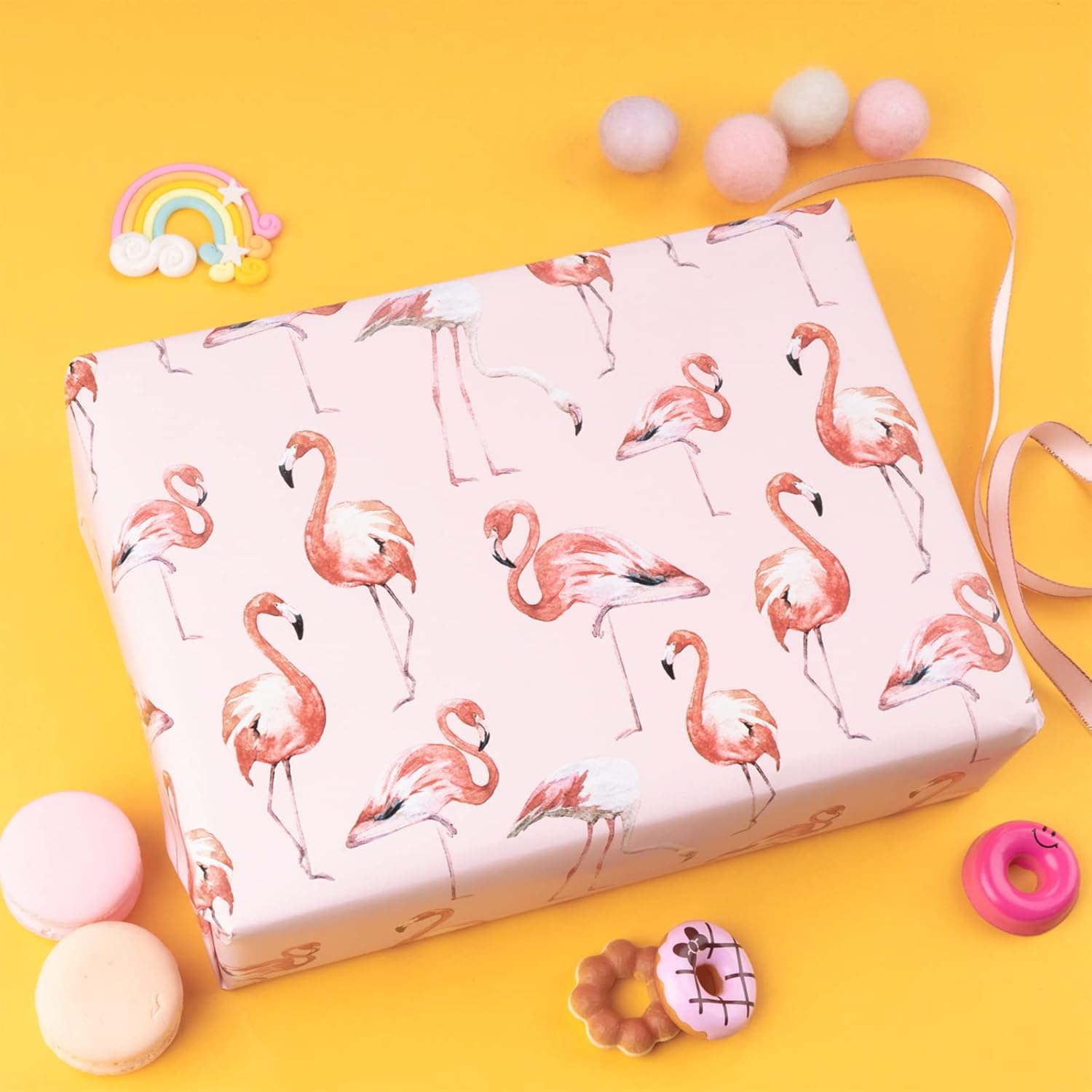 WRAPAHOLIC Reversible Flamingo Wrapping Paper - Mini Roll - 17 Inch X 33 Feet - Pink Flamingo Birthday Wrapping Paper Tropical Hawaii Design for Birthday, Holiday, Wedding, Baby Shower