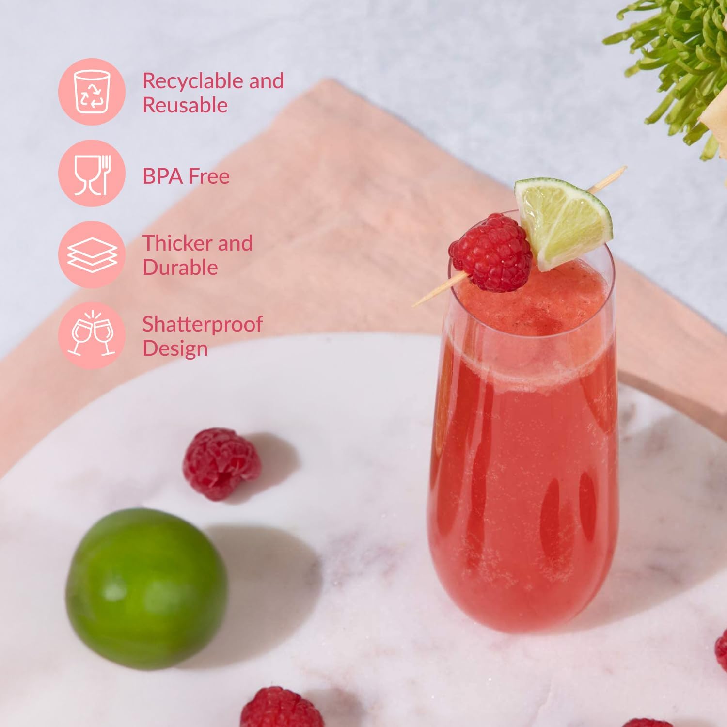 Prestee 48 Pack Plastic Champagne Flutes 9 oz - Stemless Disposable Champagne Flutes for Cocktails Mimosa Bar and Party Supplies - Clear Shatterproof Plastic Wine Glasses for Wedding and Summer Party