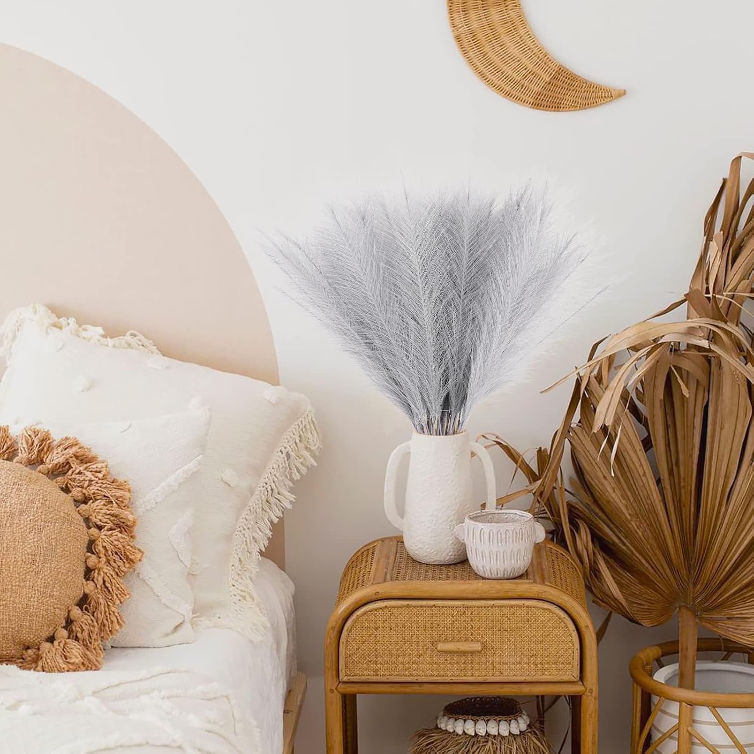 • Grey Pampas Grass Decor: You will get a pack of 50pcs artificial pampass grass, each stem 21.6”, and the heads of each stem is designed you can fluff them up for a fuller look, create a chic minimalist, or Bohemian modern display to complement your existing home arrangement