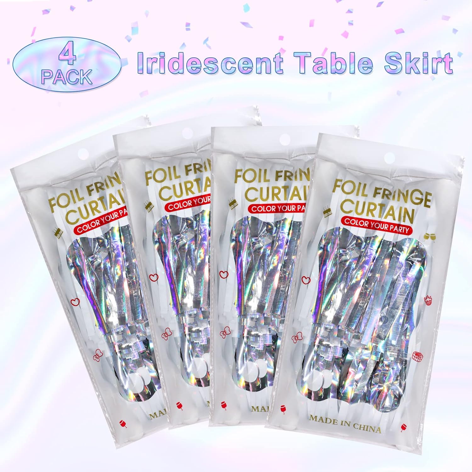4 Pack Iridescent Table Skirt, Metallic Foil Fringe Tinsel Table Skirts for Rectangle Tables, Disposable Laser Rainbow Table Skirt Iridescent Party Decorations for Birthday Wedding Holiday, 29x108Inch