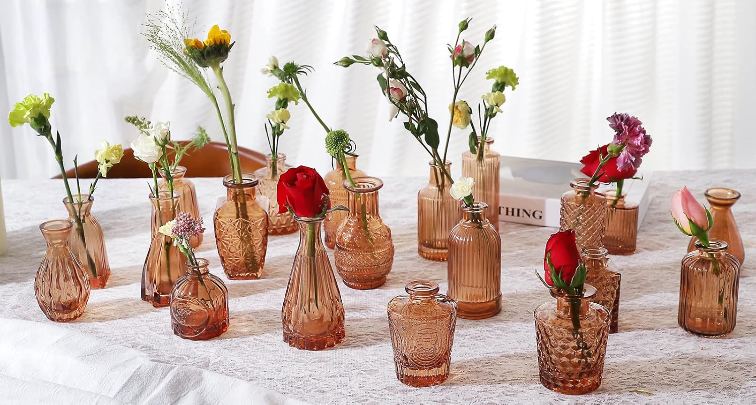 Amber Glass Bud Vases -Set of 20 for Flowers, Small Amber Bud Vases in Bulk for Centerpieces Decor, Mini Glass Set for Home Table Decorations