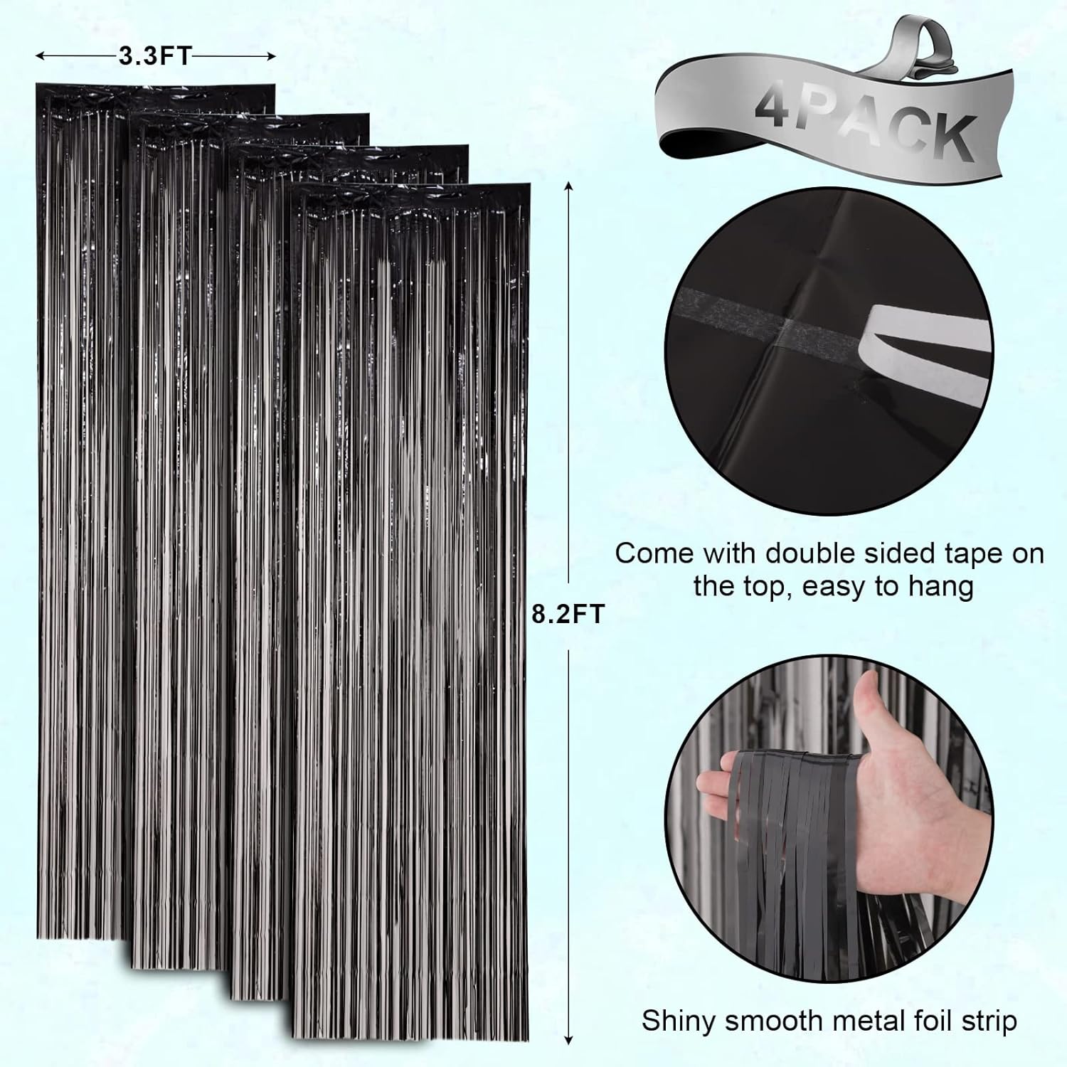 4 Pack Black Foil Fringe Backdrop Curtains, Tinsel Streamers Birthday Party Decorations, Fringe Backdrop for Graduation, Baby Shower, Gender Reveal, Disco Party
