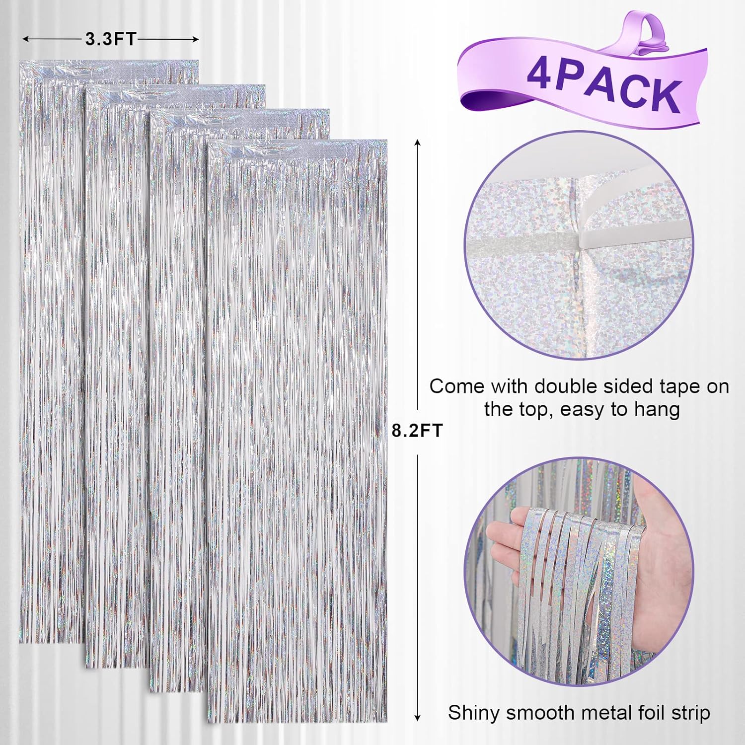 • Package Included: 4 packs of foil fringe curtains, the size of the foil curtain is 3.3*8.2 ft. It's long enough to fit any occasion. Please do not stick the foil curtain on uneven or stained walls to prevent it from falling off