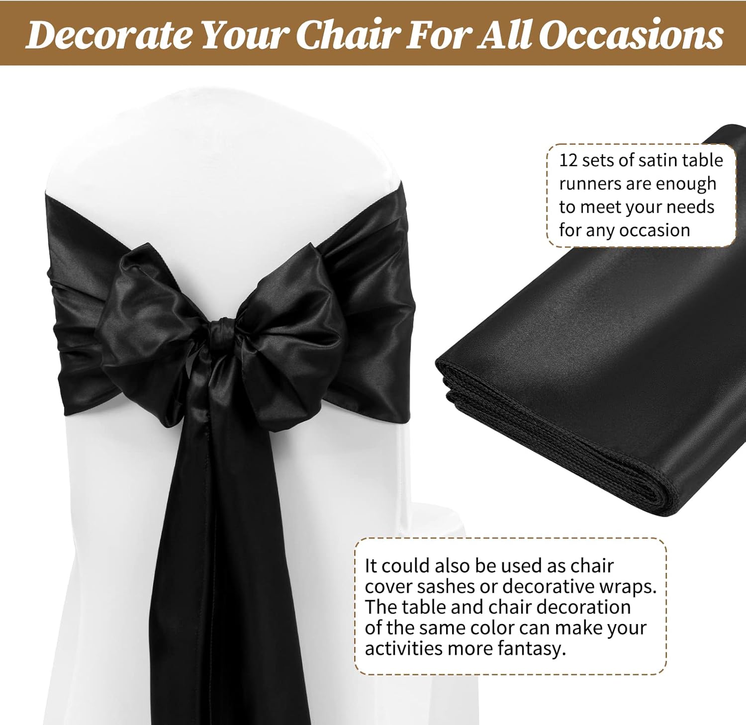 • đŸ„‚ă€Black Satin Table Runner Set】12 Pack black satin table runner measures 12" x 108" in size, appropriate for a table that can seat 8-10 people. This satin table runner can fit a 6ft/8ft rectangular table or round table well.This satin table runner is great for event table decorations.Our satin table runner make your dining table more dazzling and outstanding.Purchase our 12piece satin table runner and save even more.