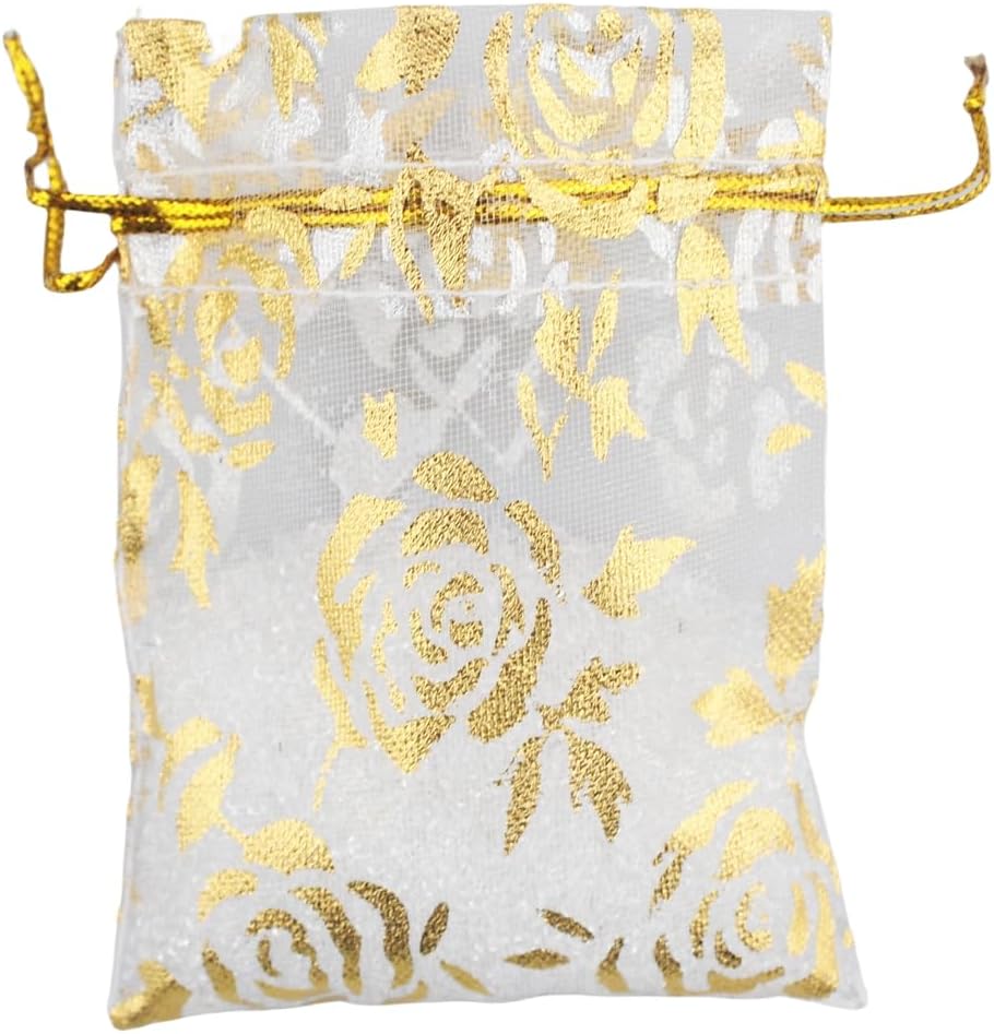 QIANHAILIZZ 100 Pack 2.8 x 3.5 Inch Flower Heart Organza Jewelry Gift Pouch Candy Pouch Drawstring Wedding Favor Bags B511S (white gold flower)