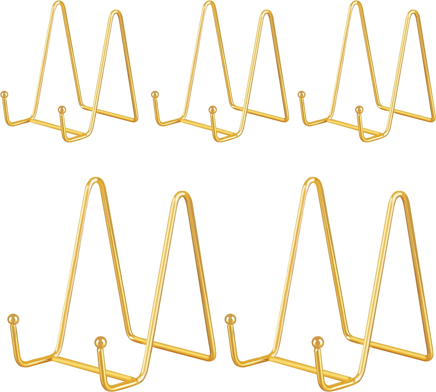 IBosins 5 Pack 4 Inch Plate Holder Display Stands, Metal Gold Frame Stand for Picture, Book, Photo Easel, Creation, Collectibles