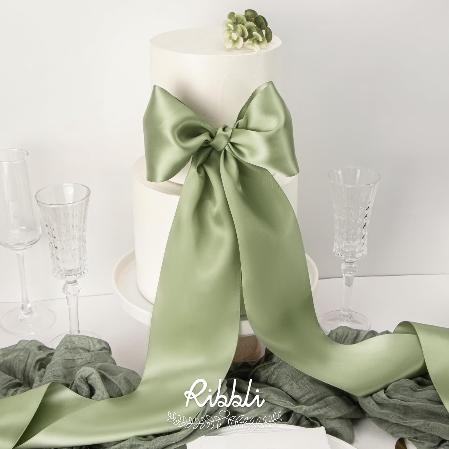 Ribbli Dusty Sage Satin Ribbon 4 Inch Wide Sage Green Ribbon for Wedding Chair Sash Grand Opening Ceremony Big Bows Gift Wrapping Floral Crafts Cake Decor-Double Faced Satin Continuous 10 Yards