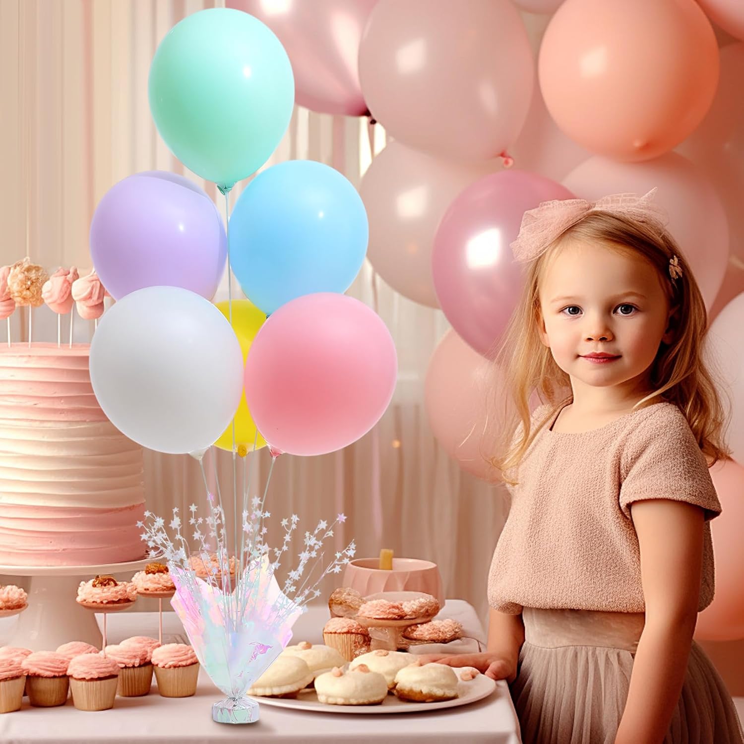 • Rainbow Balloon Centerpiece Kit Includes: 2 reusable pastel rainbow balloon stands for table (including 2 pastel foil star spray bases, 6 sticks, 6 stick connectors, and 12 cups) and 12 12-inch latex balloons, providing everything you need to create stunning table centerpieces