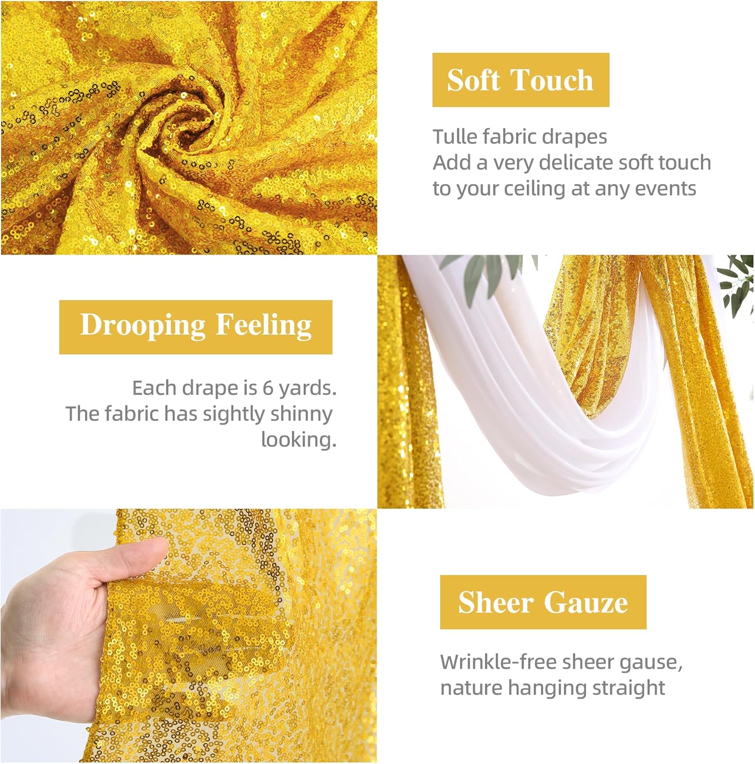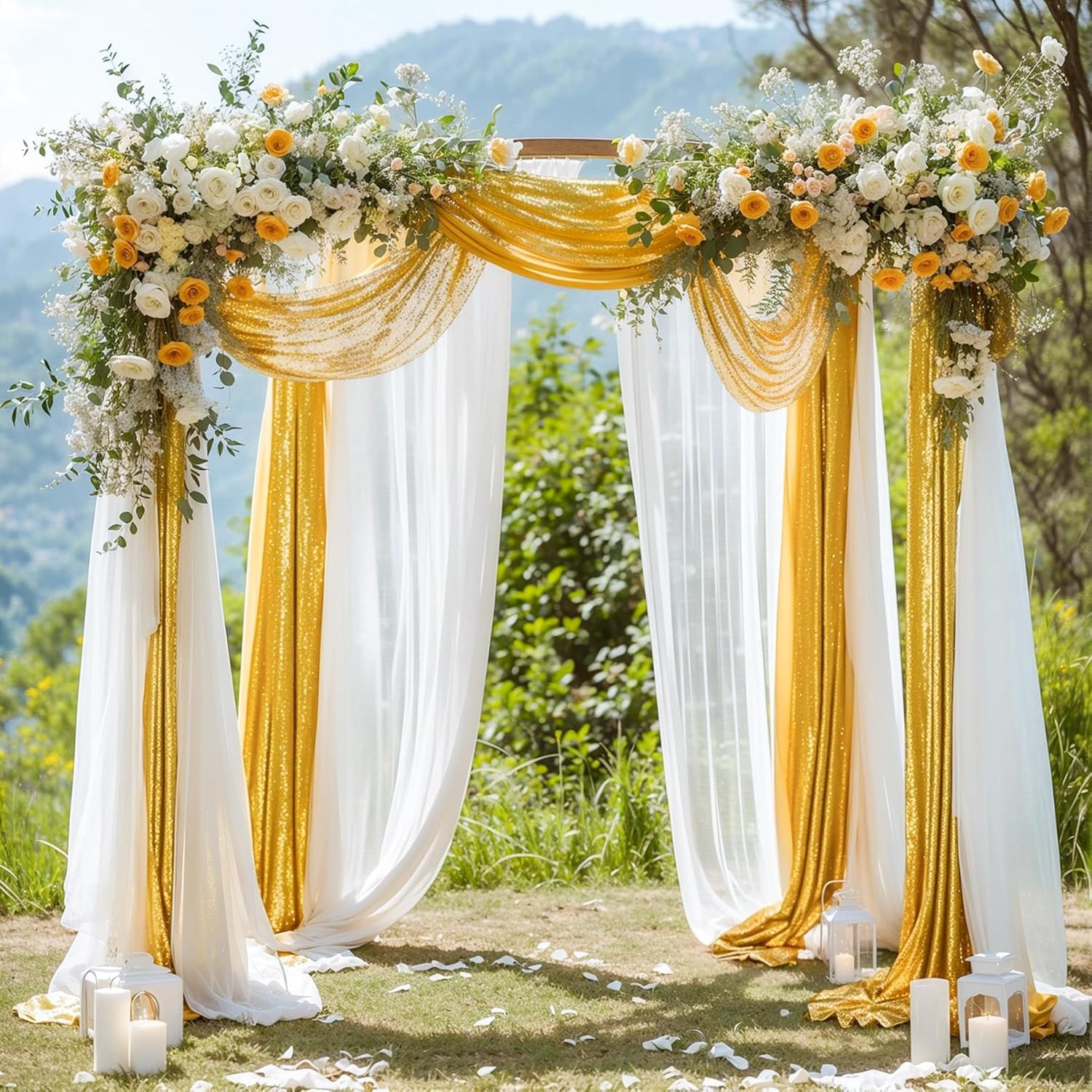 Wedding Arch Draping Fabric, 1 Panel 28" x19ft White Arch Drapes & 1 Panel 16" x19ft Gold Sequin Fabric Drapes Arbor Backdrop Curtain for Wedding Arch Ceremony Bridal Shower Reception