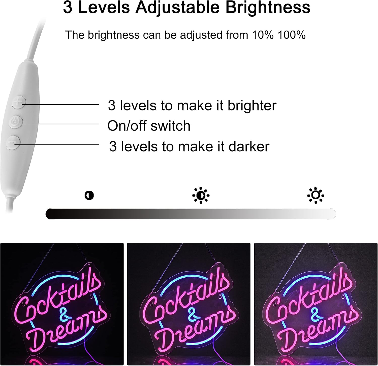 • The neon sign has dimmer on the switch , the brightness can be adjustabl