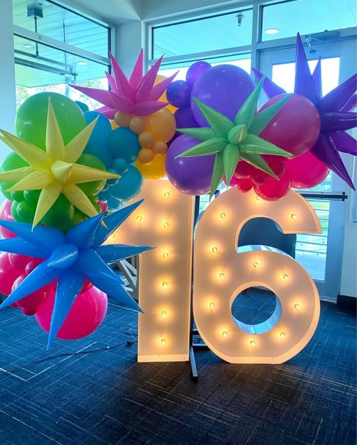 • Packing list:balloon:36pcs cone shaped balloons (12pcs cone balloons can make 1pc explosion star balloon = 3 pcs 3D foil explosion stars ) + accessories:1pc ribbon