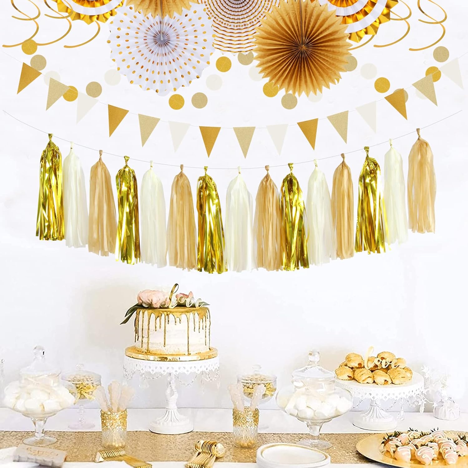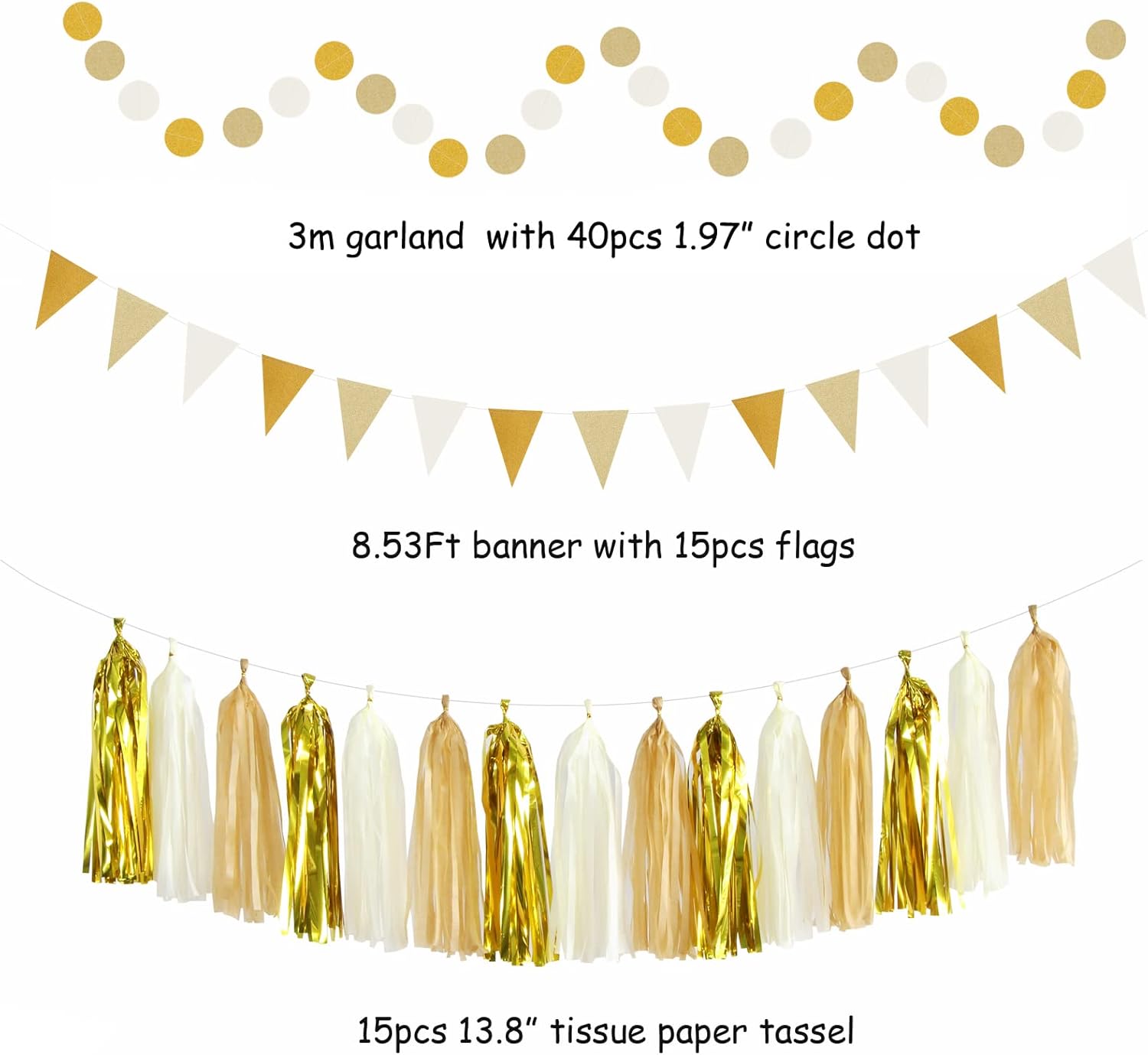 • Package Including:The white gold party decorations 1pcs paper garland dots,1pcs Triangle Flags in ivory gold champagne,15pcs tassel garland,2pcs 8” honeycomb ball,6pcs gold streamers swirl,4pcs 10” paper lantern fan in three color,3pcs 12”paper lantern fan in three color,1pcs 16”paper lantern fan.