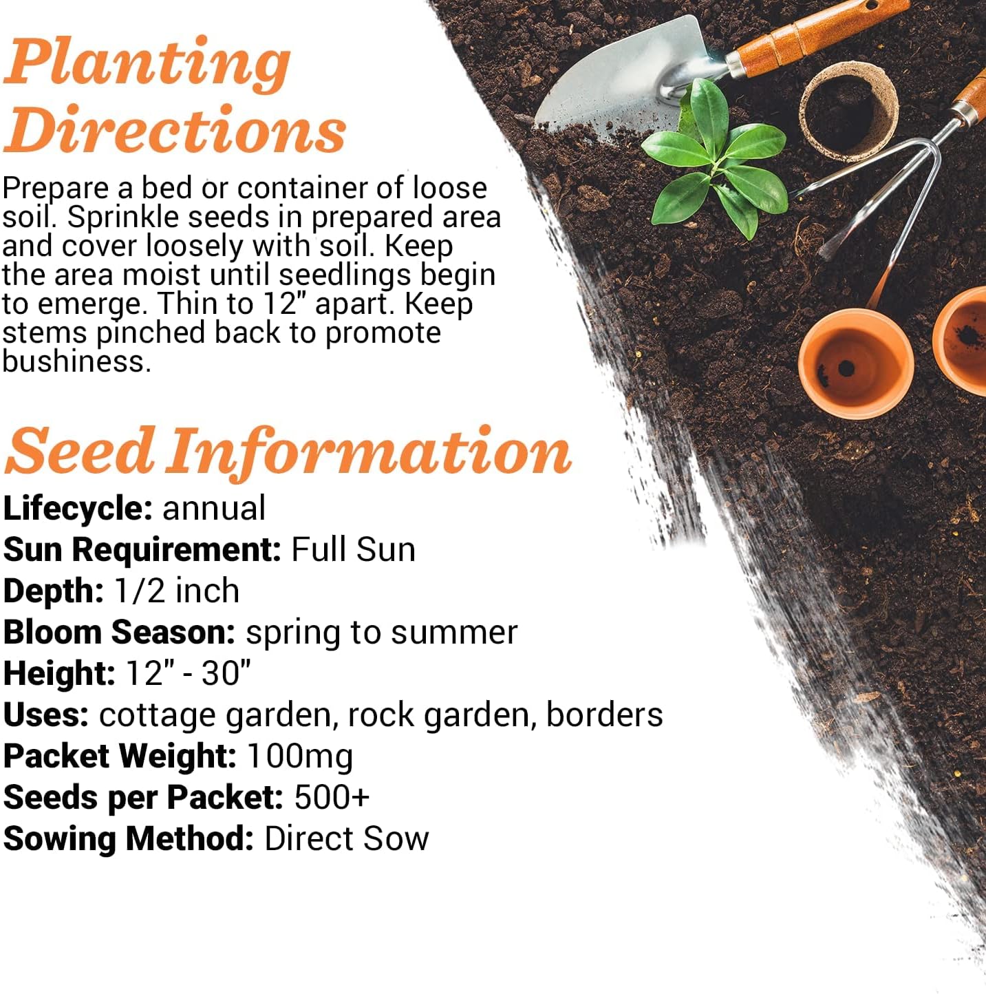 • PLANTING DIRECTIONS: Prepare a bed or container of loose soil. Sprinkle seeds in prepared area and cover loosely with soil. Keep the area moist until seedlings begin to emerge. Thin to 4"-6" apart. Keep stems pinched back to promote bushiness.
