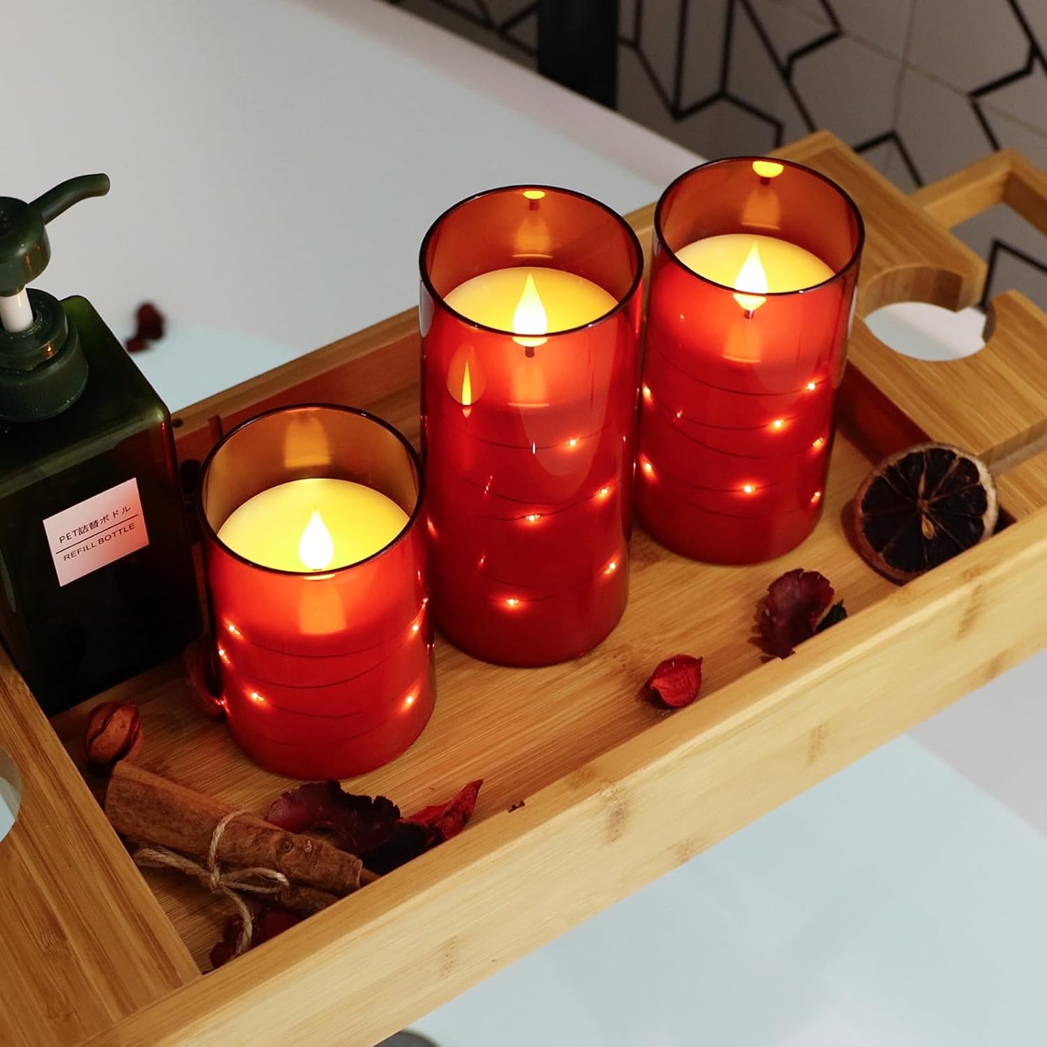 NURADA Flickering Flameless Candles: Built-in Star String Lights Battery Operated LED Pillar Candles with Remote and Timer Romantic Decorations for Wedding Party Christmas Halloween - Red 3 Pack