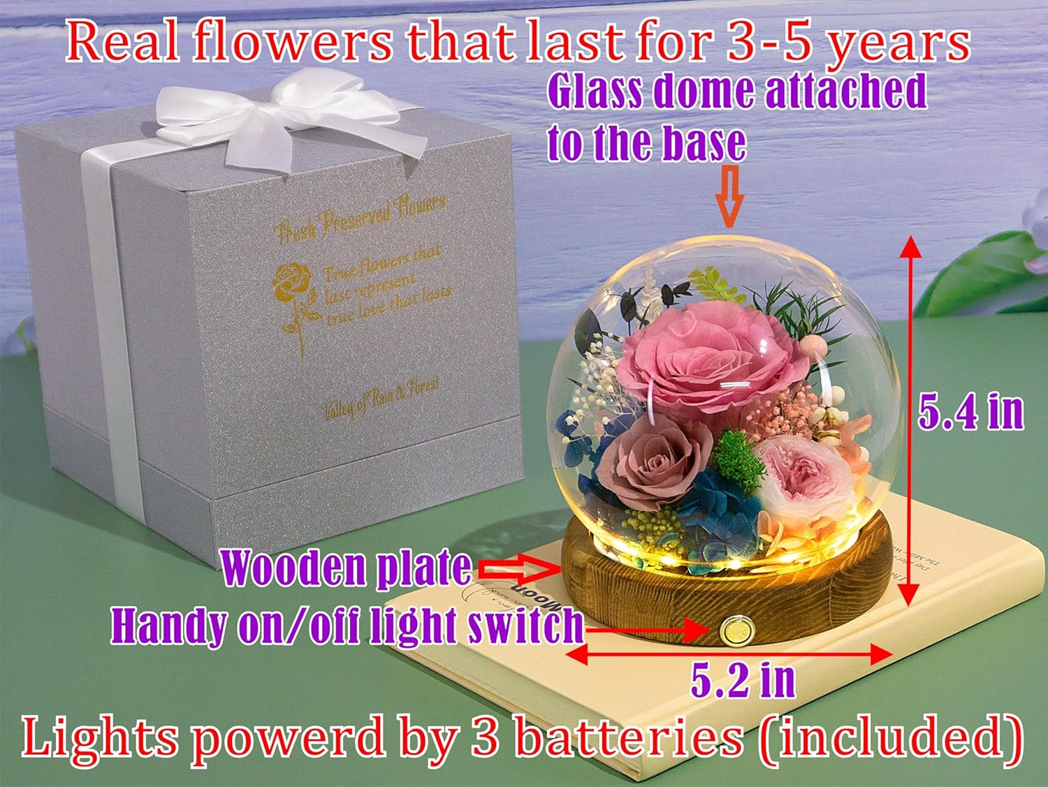 • ♥Please note♥:1. Due to the delicateness of natural flowers, opening the glass dome is not recommended as it can lead to unintended damage to the flowers. 2. Since these are real flowers crafted by hand and not mass-produced by machine, there may be slight variations in certain cases. 3. loose and incorrect battery insert will result in lights not turning on. If that's the case, simply remove the batteries and reinsert them correctly. 4. We've recently made new improvements to our products for you. For more details, simply go to the bottom of this page.