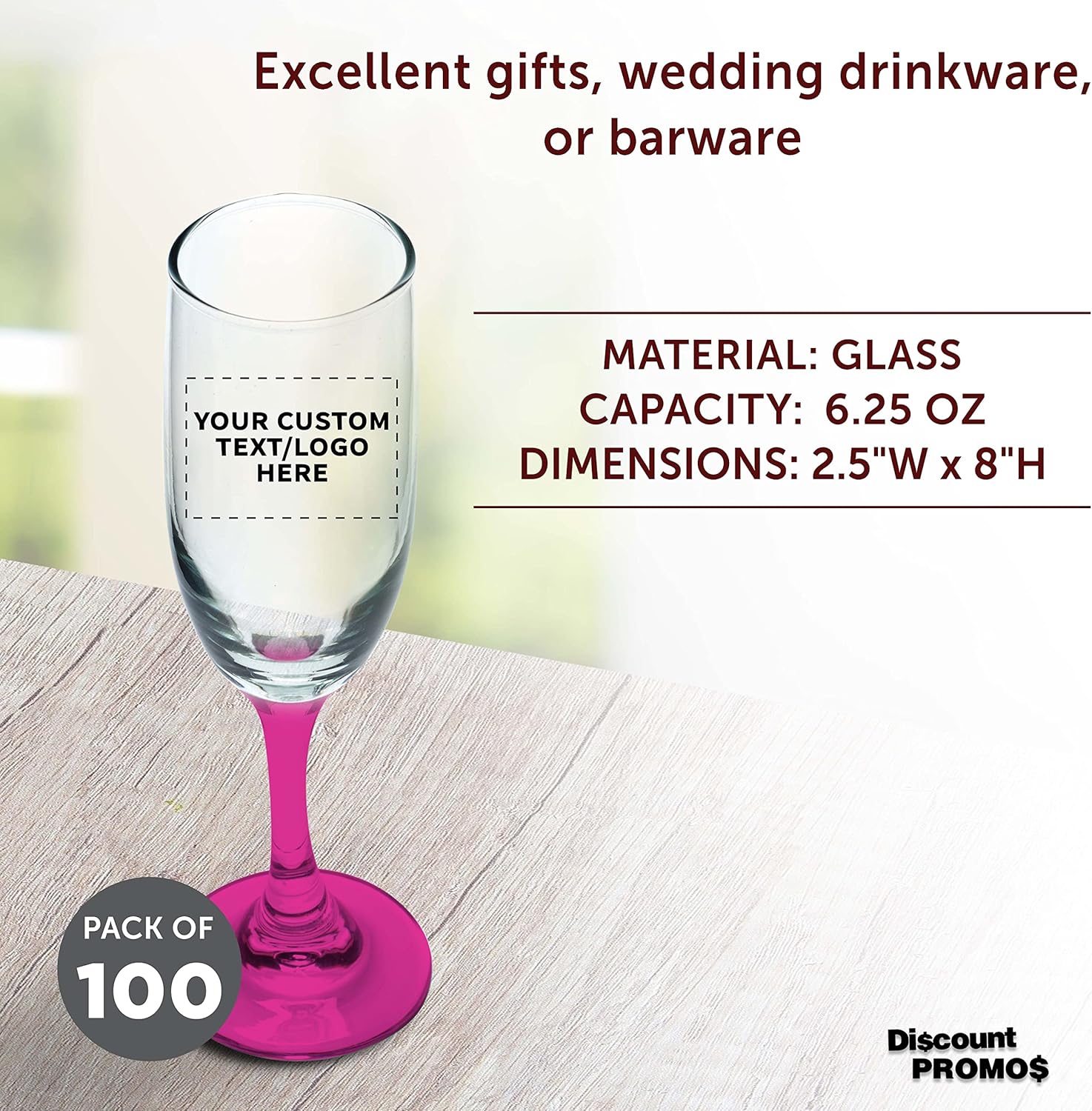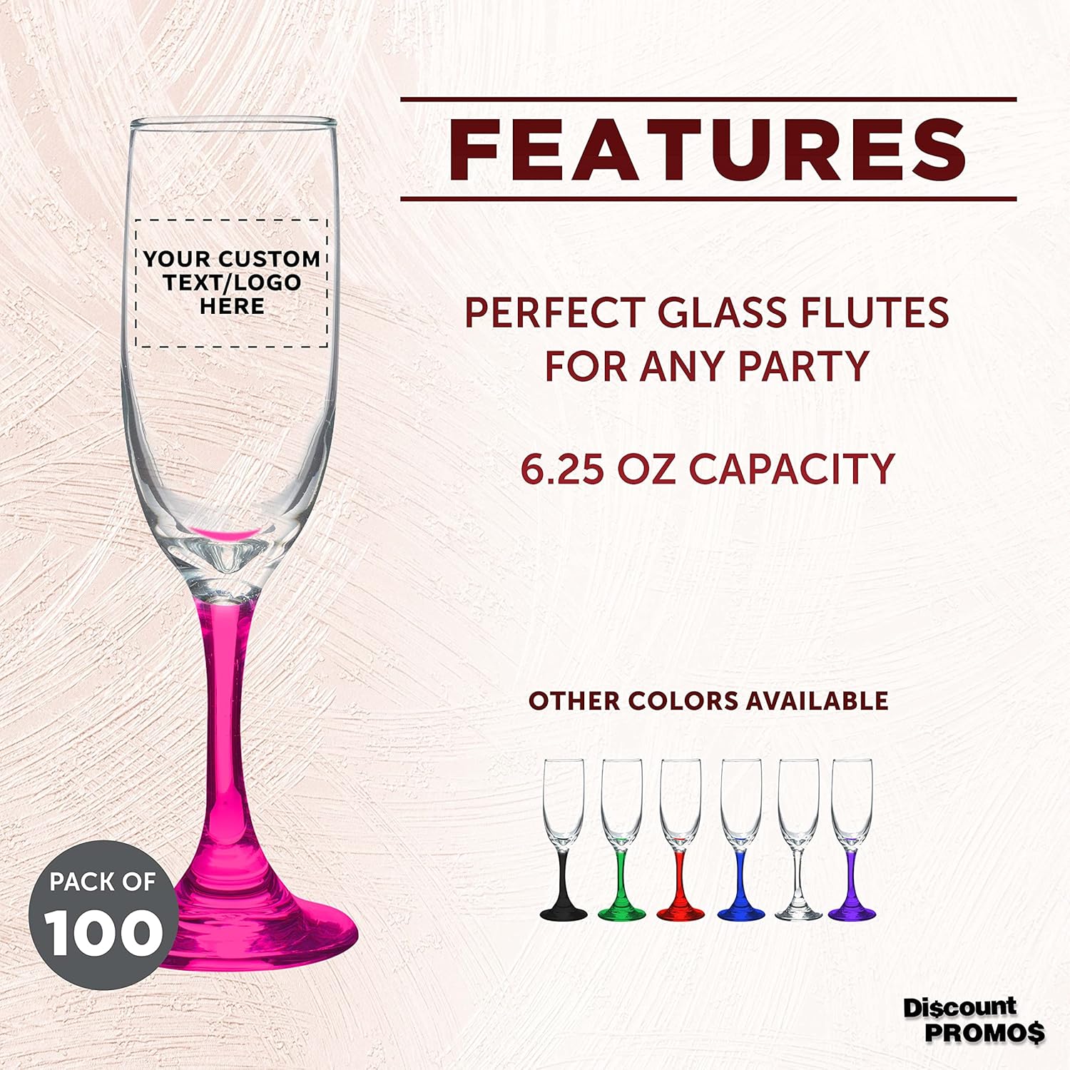 DISCOUNT PROMOS Custom Premiere Champagne Flutes 6.25 oz. Set of 100, Personalized Bulk Pack - Elegant Drinkware for Weddings, Events, & Promotional Gifts - Pink