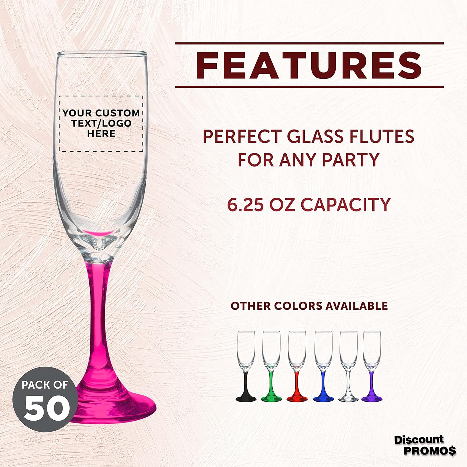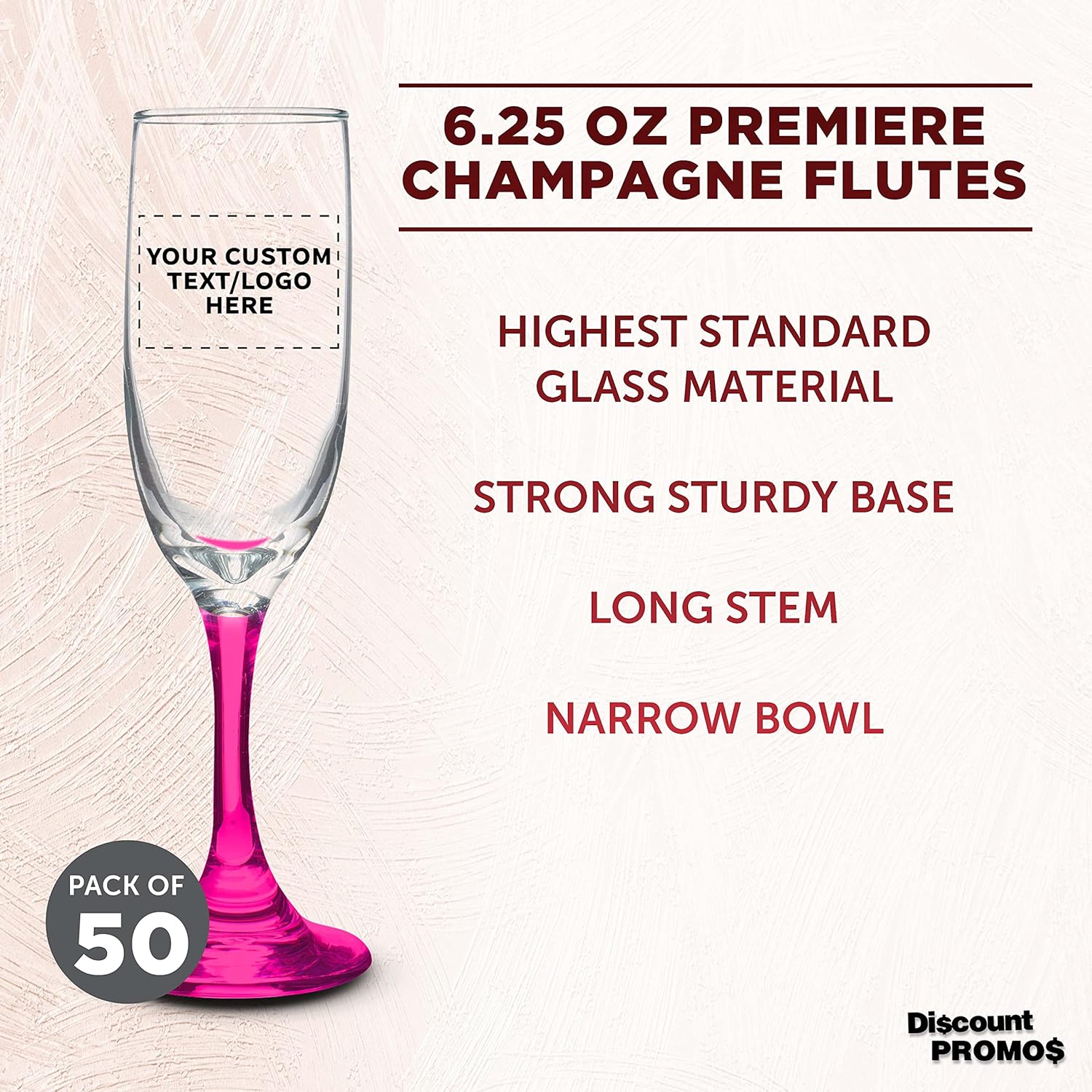 DISCOUNT PROMOS Custom Premiere Champagne Flutes 6.25 oz. Set of 50, Personalized Bulk Pack - Elegant Drinkware for Weddings, Events, & Promotional Gifts - Pink