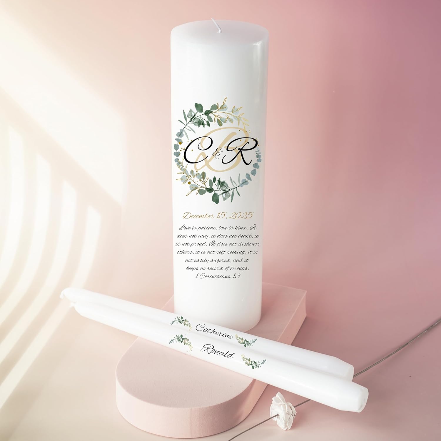Unity Candles for Wedding, Modern Unity Set, Custom and Personalized Pillar and Taper Candles with Bible Quote, Unscented White Premium Wax, Religious and Wedding Ceremony, Special Events (Zinnia)