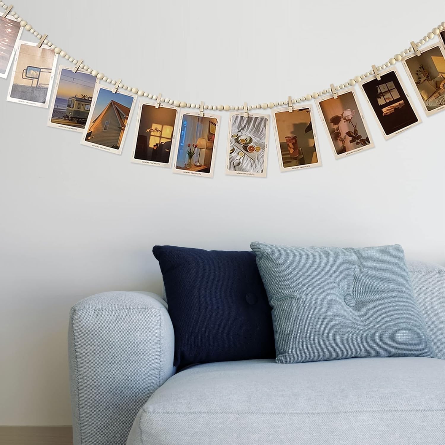 Hanging Photo Display With 12 Clips, Wooden Bead Garland 2PCS, Boho Style Collage Photo Frame Decoration for Dorms, Classrooms, Bedrooms