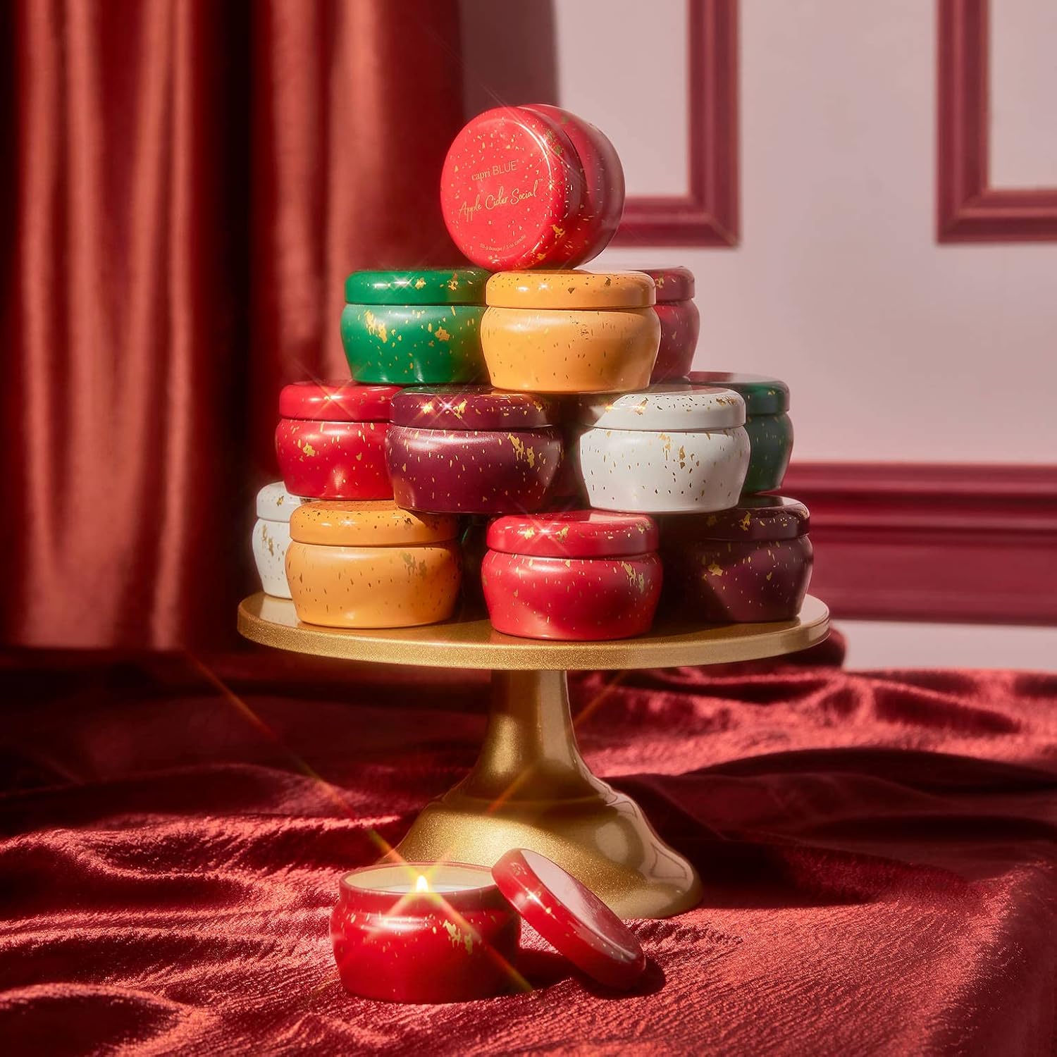 Capri Blue Glimmer Mini Tin - Apple Scented Candle with Mini Candle Holder - Soy Wax Blend - Capri Blue Apple Cider Social Red and Gold (3 oz)
