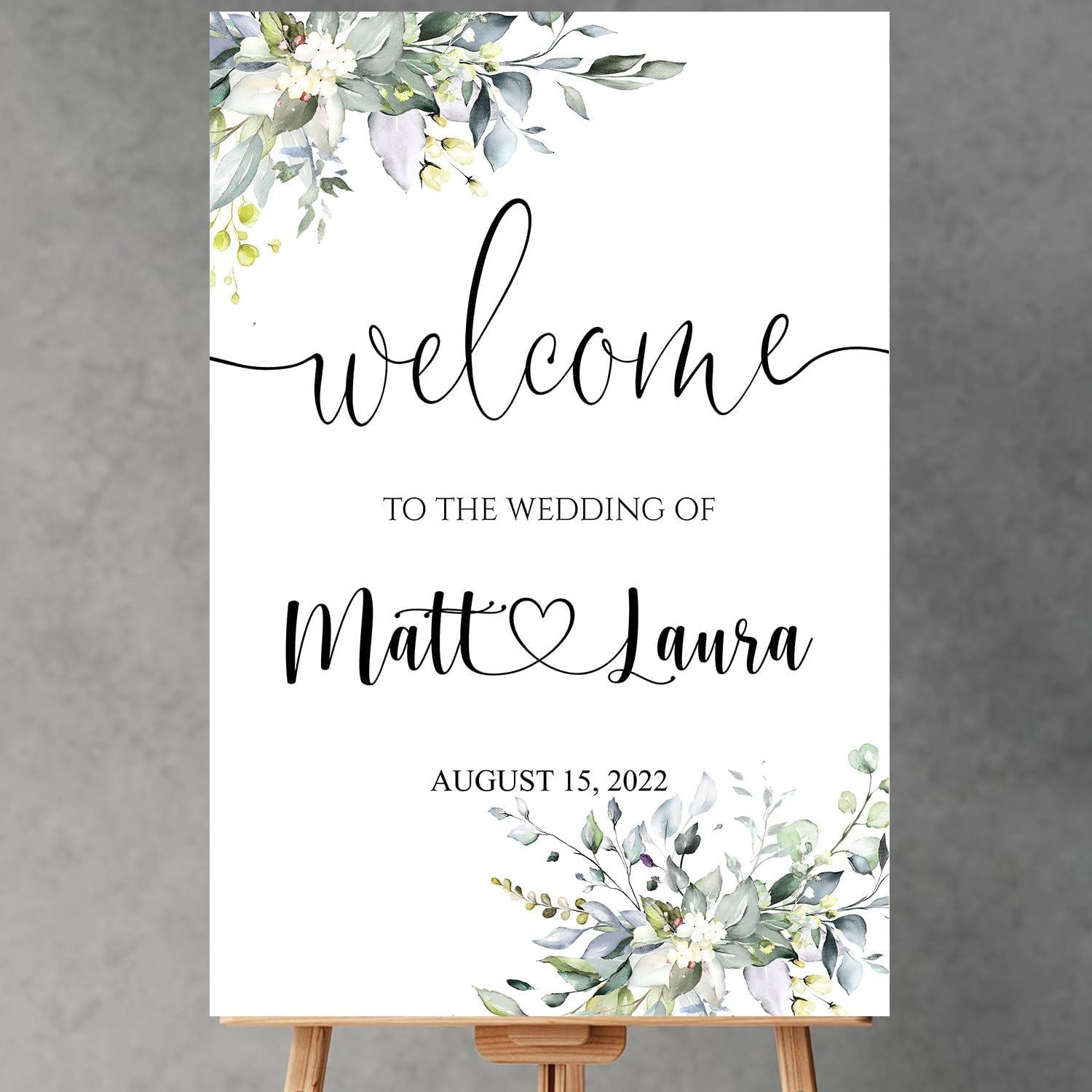 Generic Eucalyptus Wedding Welcome Sign, Editable Plastic Wedding Sign, 12x18, 18x27, 24x36 Inch, 4mm Thick, Weatherproof & Fade-Resistant, Customizable with Names, Date, Message